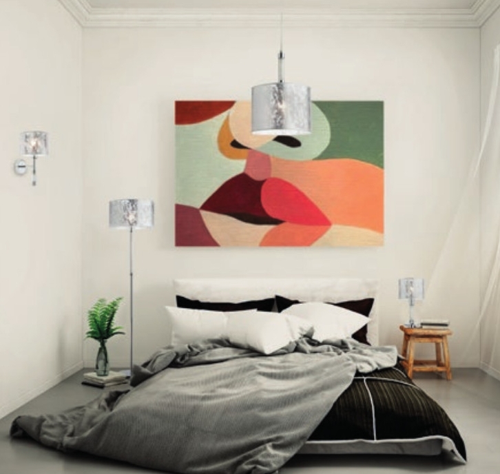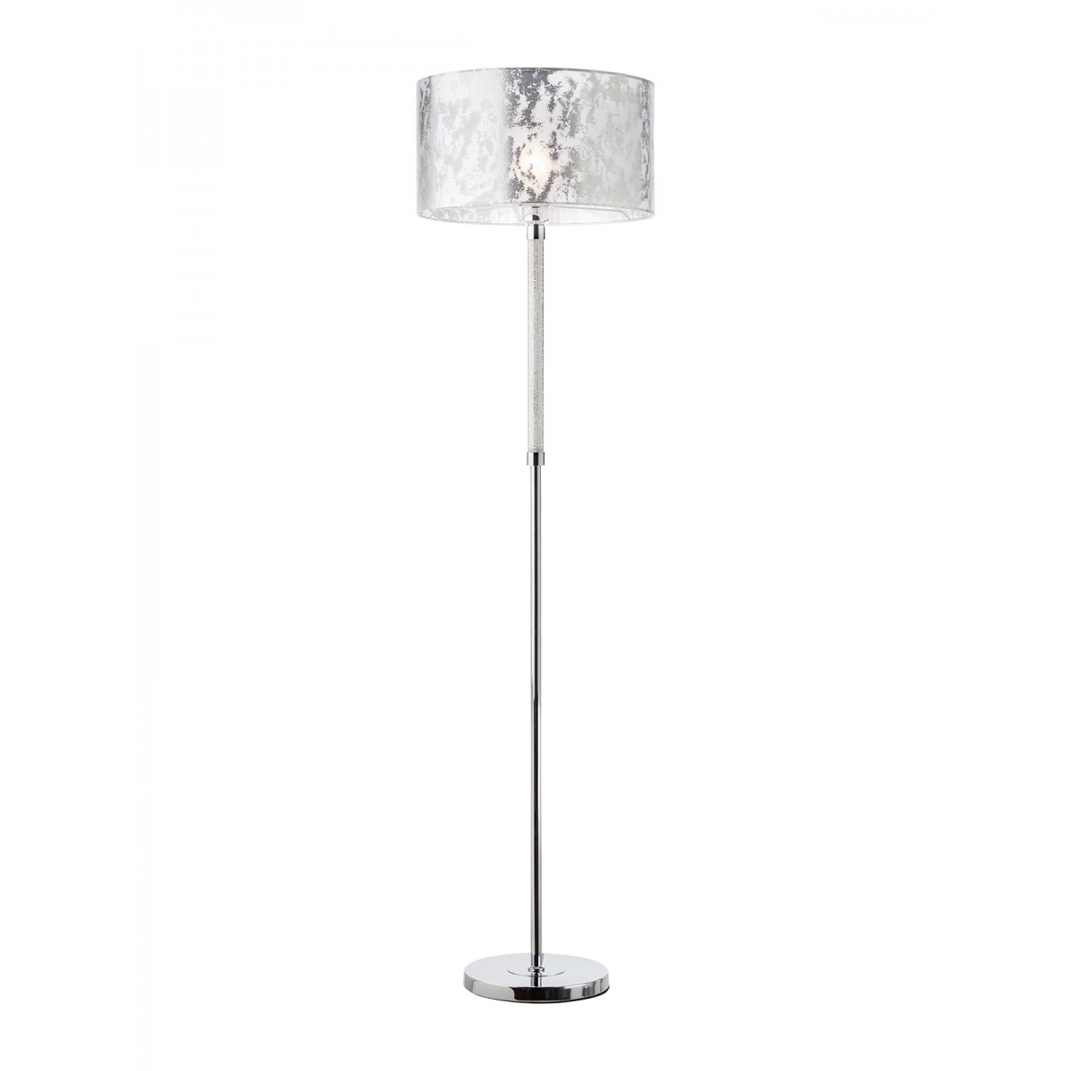 хромиран метал, прозрачно огнеупорно стъкло със стъклени орнаменти, абажур от сребрист текстил на петна