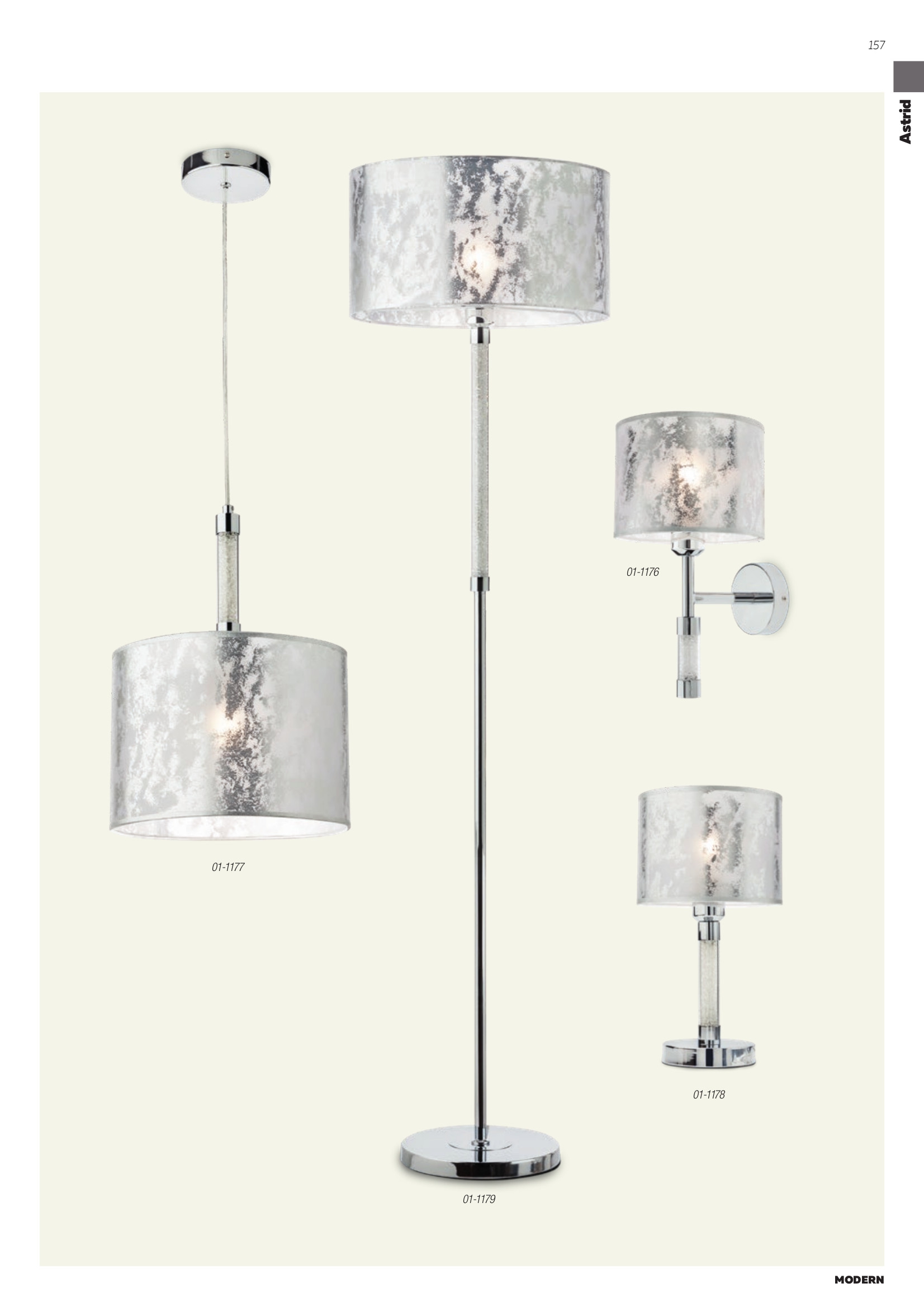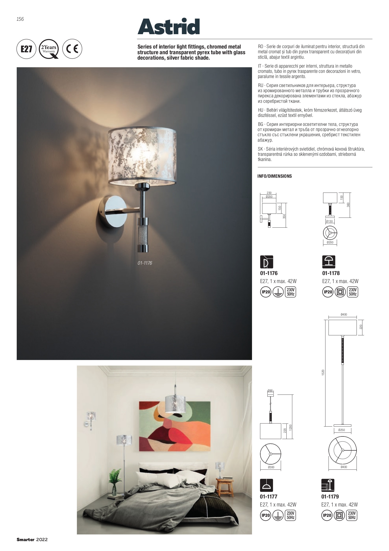 Осветителното тяло 01-1179 ще осигури комфорт и естетика във всяко помещение, в което се постави. Цялостната визия и дизайн на лампата и вложените в изработката й материали, като хромиран метал, прозрачно огнеупорно стъкло със стъклени орнаменти, абажур от сребрист текстил на петна, ще допринесат за един неповторим стил. Благодарение на дългогодишния опит, качествените материали и строгия контрол на качеството на изработка на дизайнерската линия Redo Smarter на производителя Redo (Румъния), 01-1179 е на високо европейско ниво.