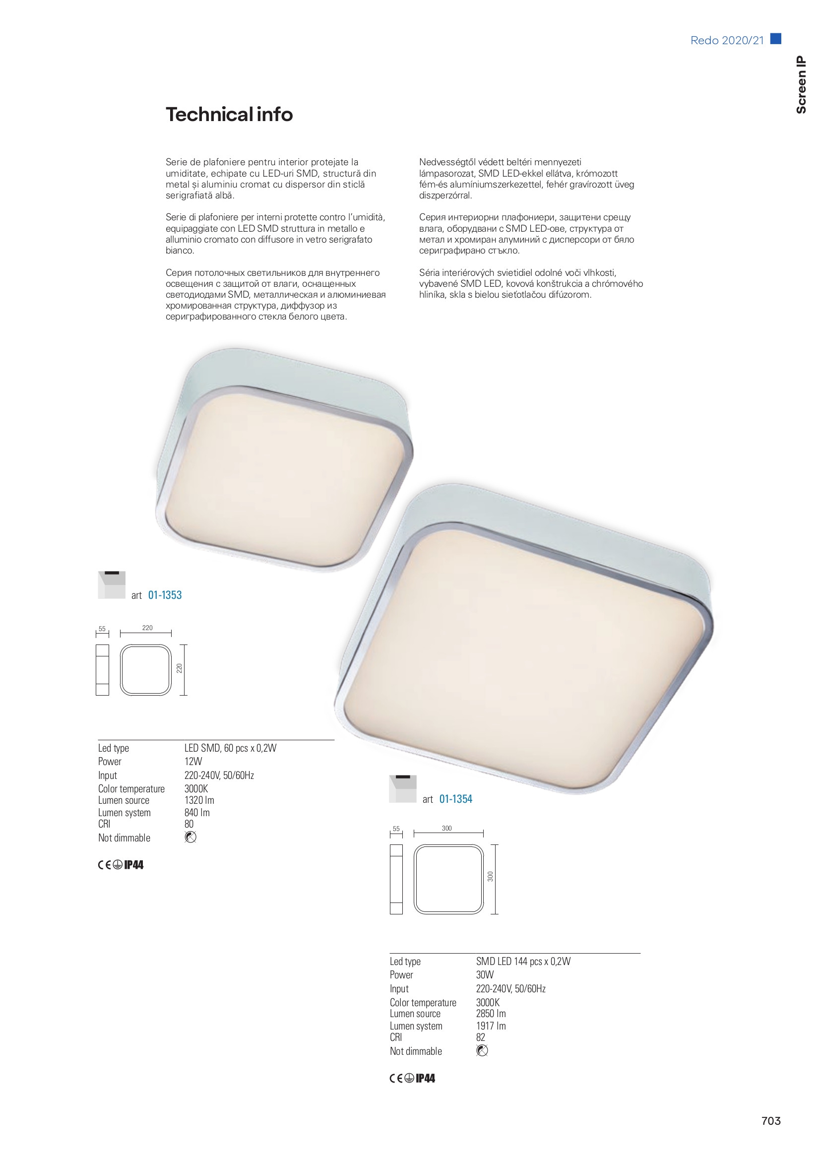 Осветителното тяло 01-1353 ще осигури комфорт и естетика във всяко помещение, в което се постави. Цялостната визия и дизайн на лампата и вложените в изработката й материали, като метал и хромиран алуминий, дифузер от бяло сериграфирано стъкло, ще допринесат за един неповторим стил. Благодарение на дългогодишния опит, качествените материали и строгия контрол на качеството на изработка на дизайнерската линия Redo Indoor на производителя Redo (Румъния), 01-1353 е на високо европейско ниво.