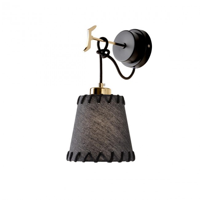 метал в цвят черен мат, метален детайл в златисто, абажур от лен в тъмно сиво, кабел с черна текстилна оплетка