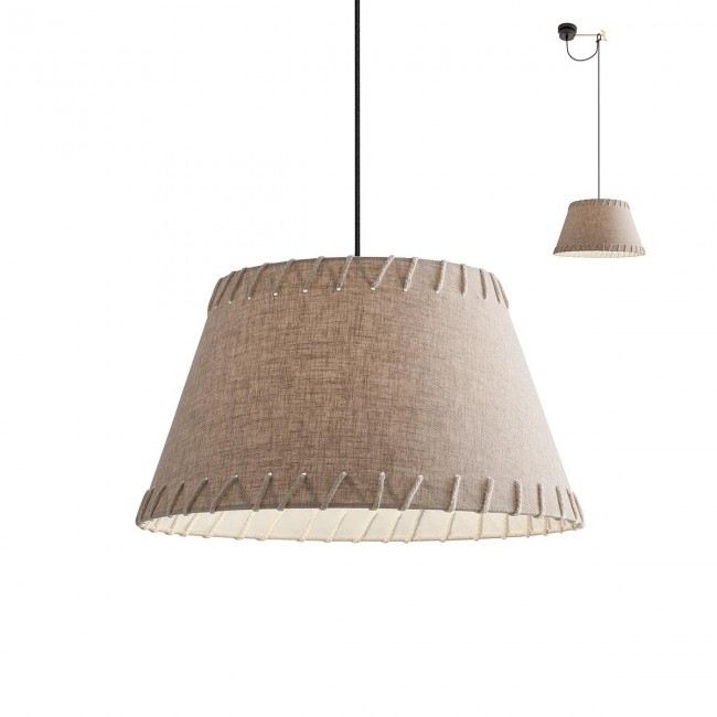 Стилът и естетиката на обстановката ще се обогатят благодарение, както на цялостната визия и дизайн на осветителното тяло, така и на вложените в изработката му, качествени материали, като: метал в цвят черен мат, метален детайл в златисто, абажур от лен в бежово, кабел с черна текстилна оплетка.