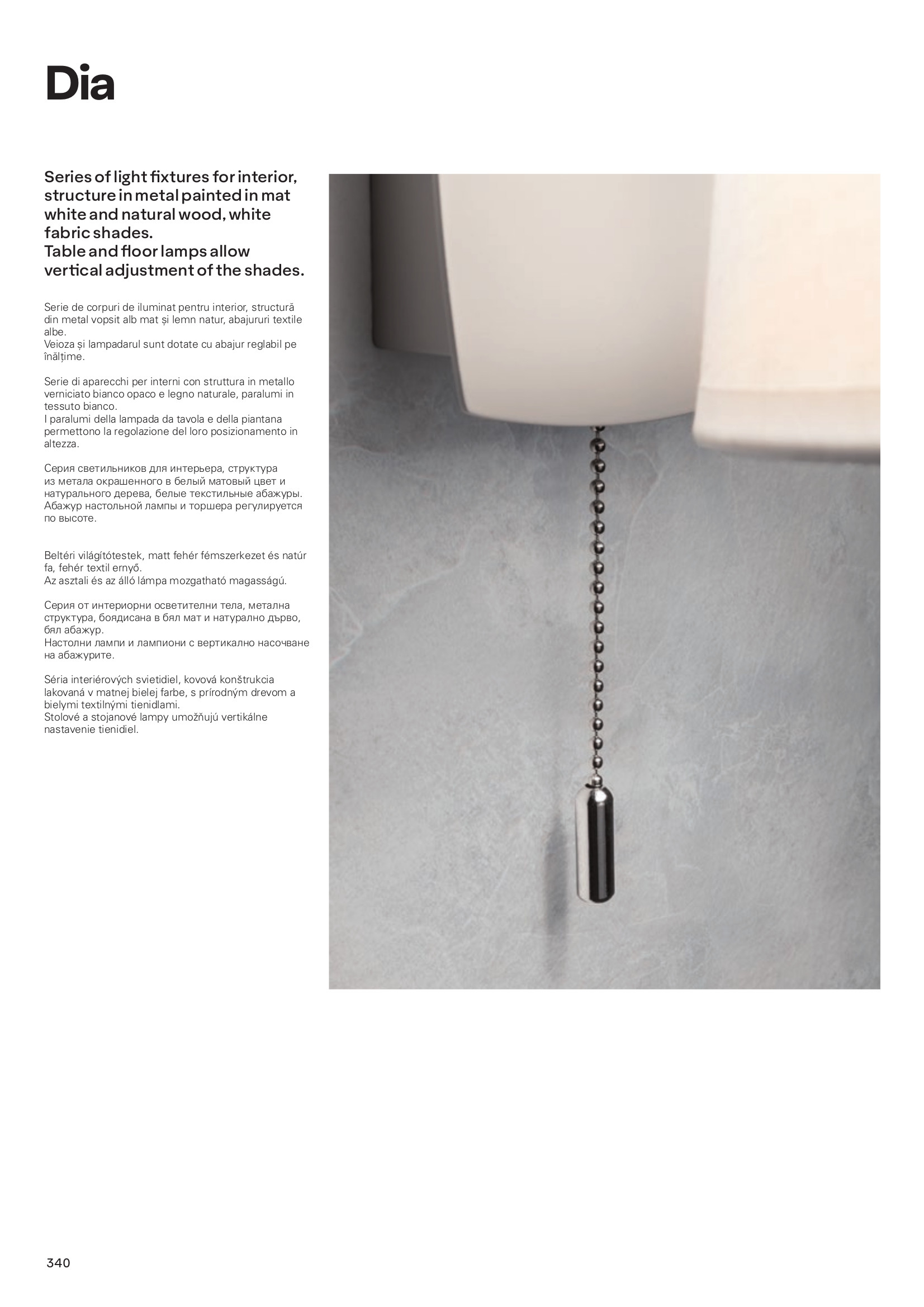 метал в цвят бял мат, натурално дърво, абажур от бял текстил, чиято височина се регулира