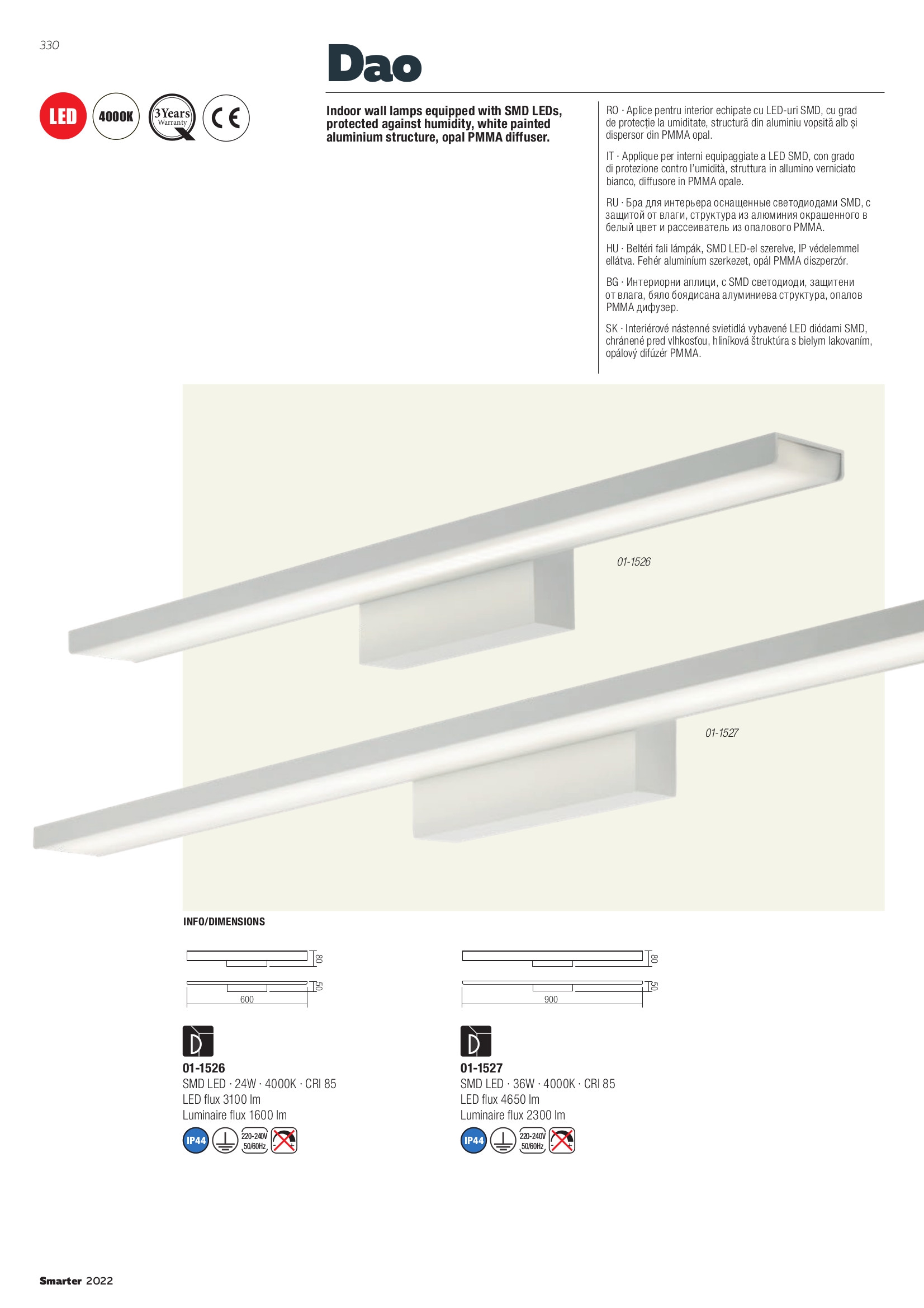 Лед аплик 01-1526 ще осигури комфорт и естетика във всяко помещение, в което се постави. Цялостната визия и дизайн на led лампата и вложените в изработката й материали, като алуминий в бял цвят, дифузер от PMMA в опалово бяло, ще допринесат за един неповторим стил. Благодарение на дългогодишния опит в производството на лед осветление, качествените материали и строгия контрол на качеството на изработка на дизайнерската линия Redo Smarter на производителя Redo (Румъния), 01-1526 е на високо европейско ниво.