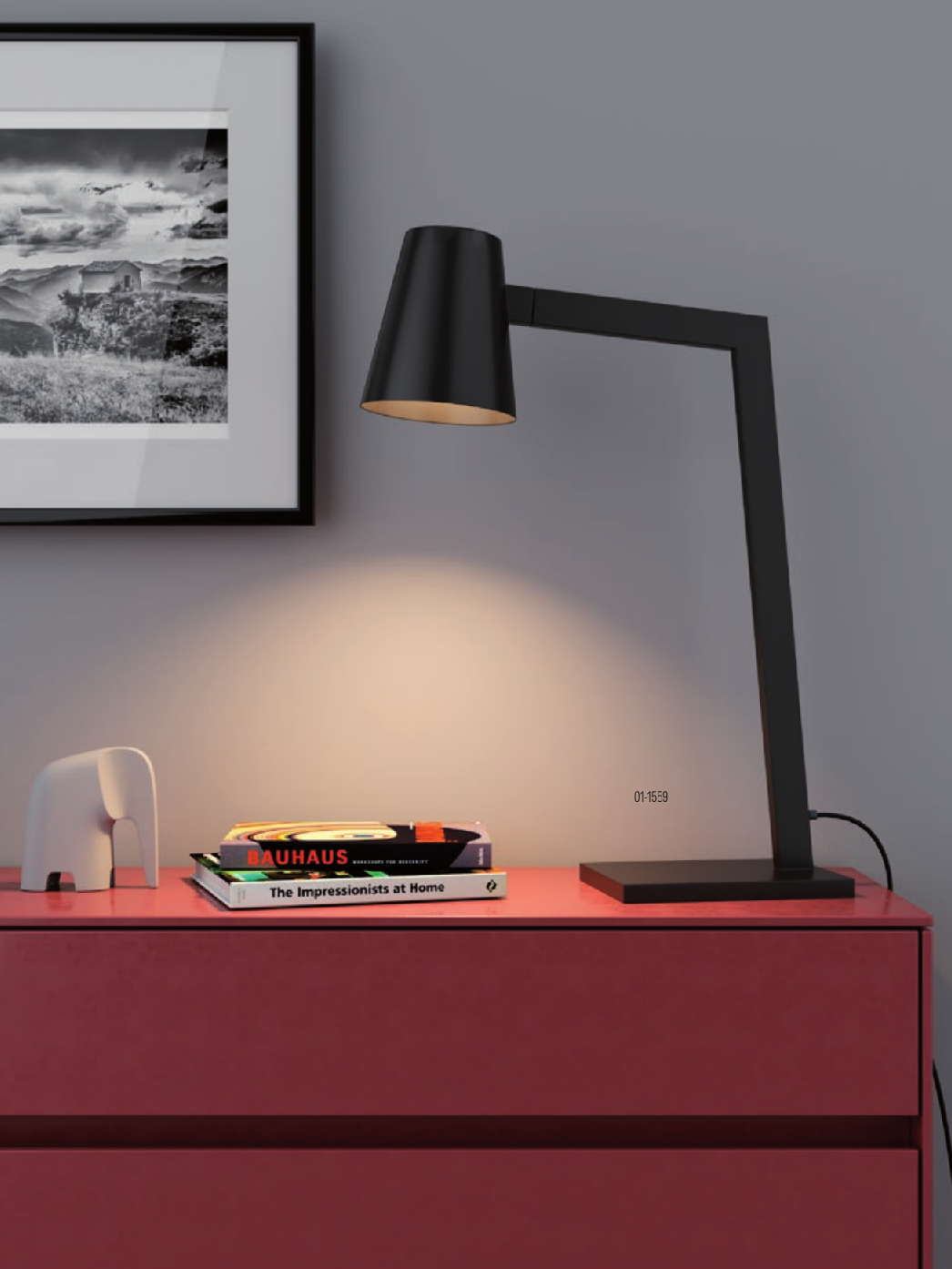 Осветителното тяло 01-1559 представлява настолна лампа в съвременен стил. 01-1559 е от категорията осветителни тела и е подходящо за осветяване на различни помещения и пространства като: всекидневна / хол, спалня, трапезария, офис.