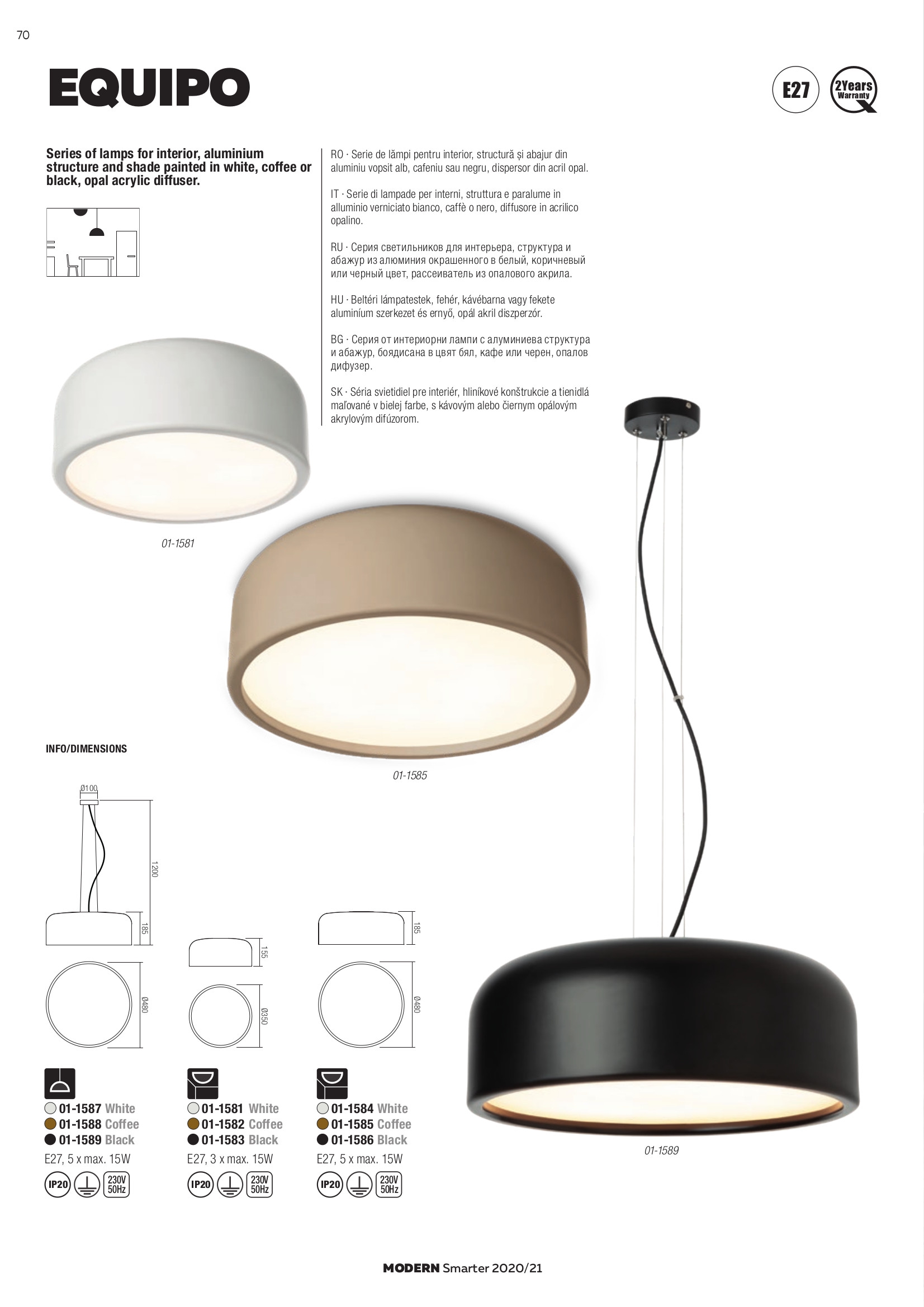 Осветителното тяло 01-1589 ще осигури комфорт и естетика във всяко помещение, в което се постави. Цялостната визия и дизайн на лампата и вложените в изработката й материали, като алуминий в черен цвят, дифузер от полимер в опалово бяло, ще допринесат за един неповторим стил. Благодарение на дългогодишния опит, качествените материали и строгия контрол на качеството на изработка на дизайнерската линия Redo Smarter на производителя Redo (Румъния), 01-1589 е на високо европейско ниво.