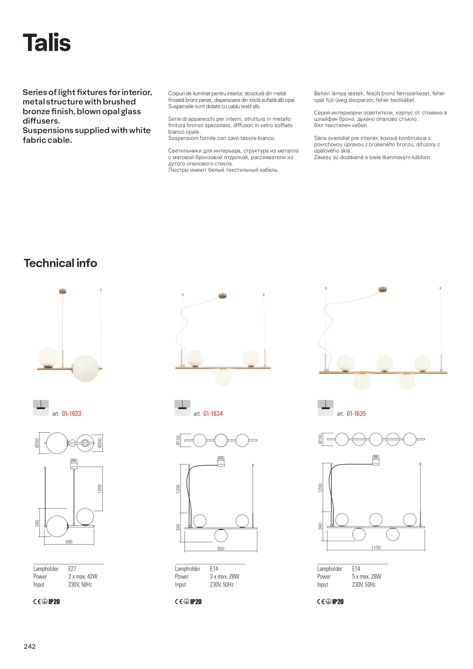 Осветителното тяло 01-1633 ще осигури комфорт и естетика във всяко помещение, в което се постави. Цялостната визия и дизайн на лампата и вложените в изработката й материали, като метал с покритие от шлайфан бронз, издухано бяло стъкло, кабел с бяла текстилна оплетка, ще допринесат за един неповторим стил. Благодарение на дългогодишния опит, качествените материали и строгия контрол на качеството на изработка на дизайнерската линия Redo Indoor на производителя Redo (Румъния), 01-1633 е на високо европейско ниво.