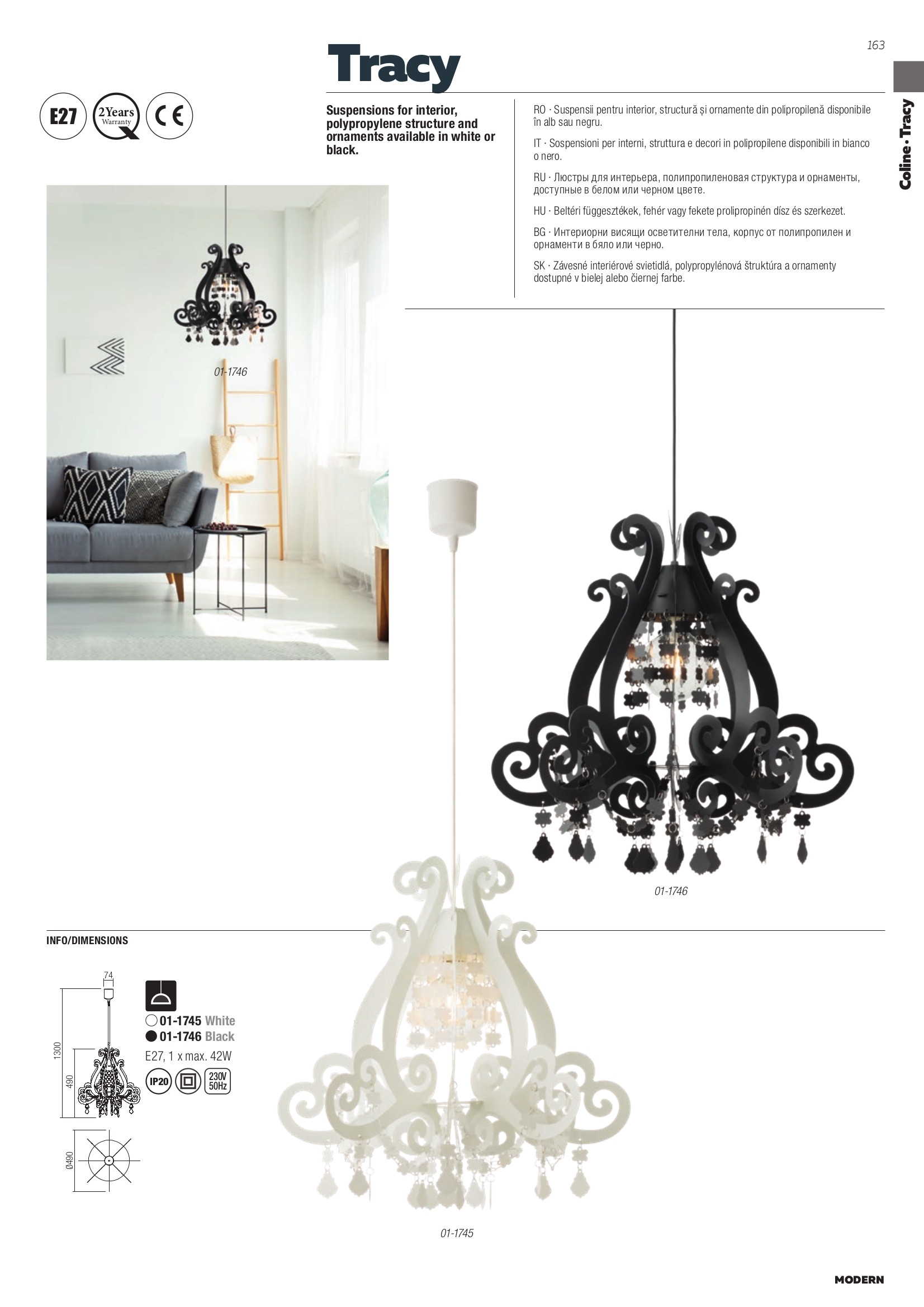 Осветителното тяло 01-1745 представлява полилей в съвременен стил. 01-1745 е от категорията осветителни тела и е подходящо за осветяване на различни помещения и пространства като: всекидневна / хол, спалня, кухня, трапезария, офис.