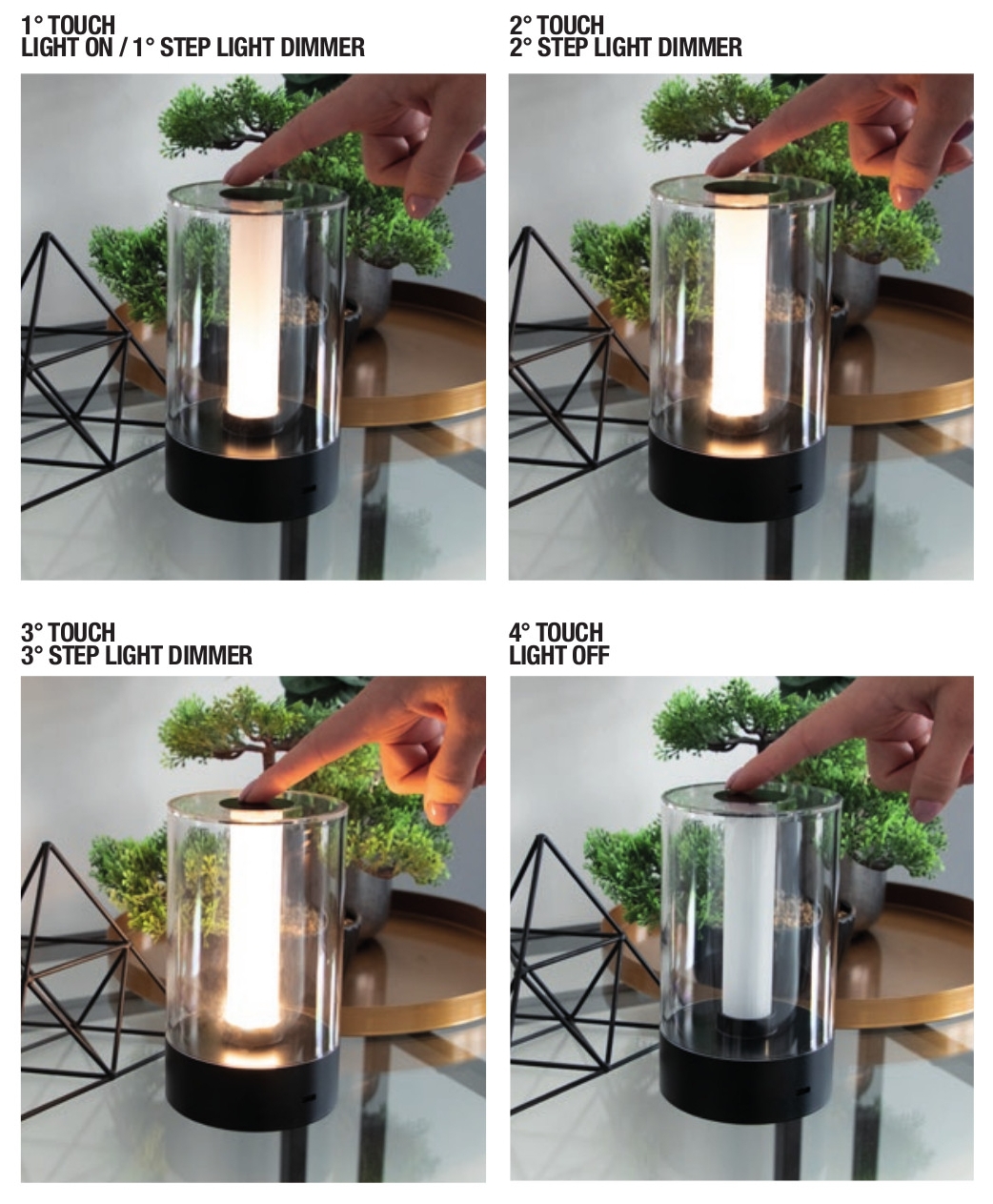 метал в цвят червена мед, двоен дифузер - от прозрачен акрил и от акрил с ефект заскрежено бяло, USB порт за зареждане, touch тристъпков димер