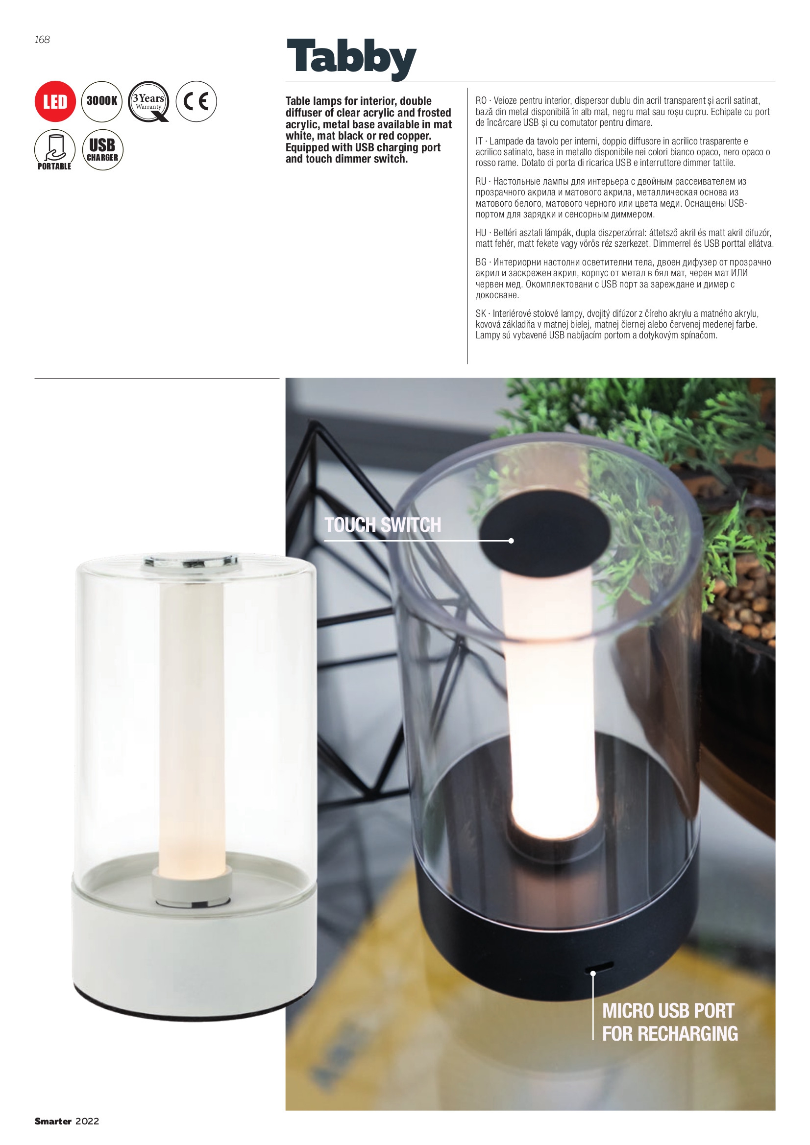 Осветителното тяло 01-1748 ще осигури комфорт и естетика във всяко помещение, в което се постави. Цялостната визия и дизайн на лампата и вложените в изработката й материали, като метал в цвят червена мед, двоен дифузер - от прозрачен акрил и от акрил с ефект заскрежено бяло, USB порт за зареждане, touch тристъпков димер, ще допринесат за един неповторим стил. Благодарение на дългогодишния опит, качествените материали и строгия контрол на качеството на изработка на дизайнерската линия Redo Smarter на производителя Redo (Румъния), 01-1748 е на високо европейско ниво.