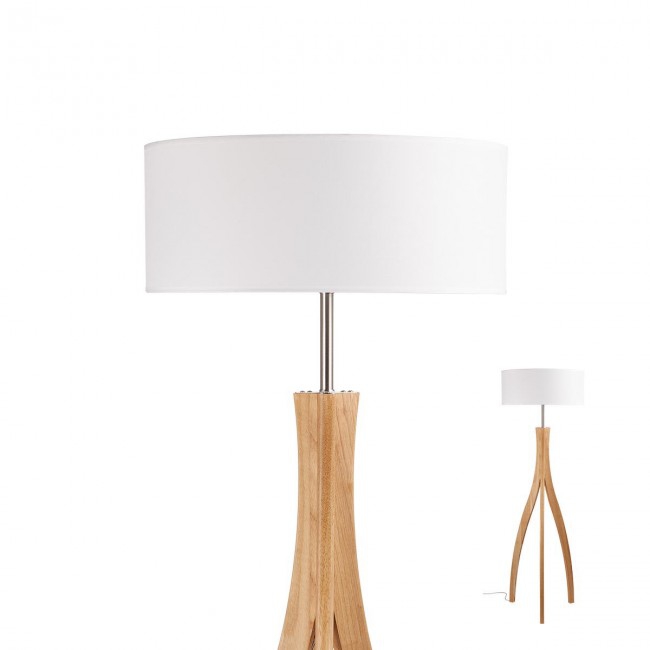 дърво в естествен цвят (дъб) с метални части в цвят сатен никел, бял абажур от текстил върху полимерна основа