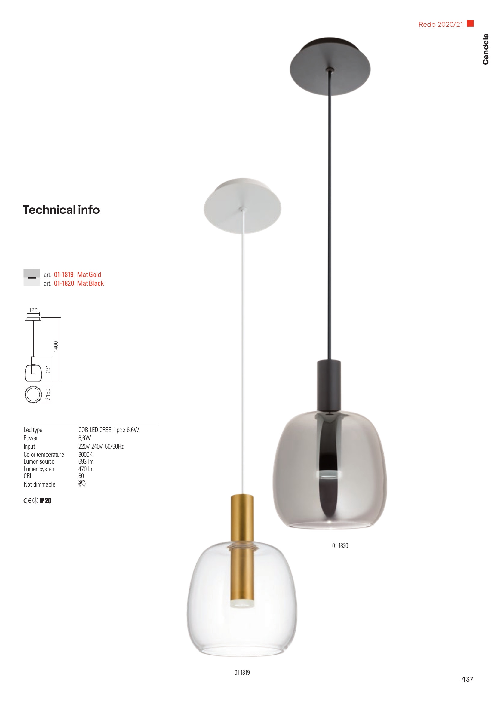 Лед пендел 01-1820 ще осигури комфорт и естетика във всяко помещение, в което се постави. Цялостната визия и дизайн на led лампата и вложените в изработката й материали, като алуминий в цвят черен мат, опушено издухано стъкло, ще допринесат за един неповторим стил. Благодарение на дългогодишния опит в производството на лед осветление, качествените материали и строгия контрол на качеството на изработка на дизайнерската линия Redo Indoor на производителя Redo (Румъния), 01-1820 е на високо европейско ниво.