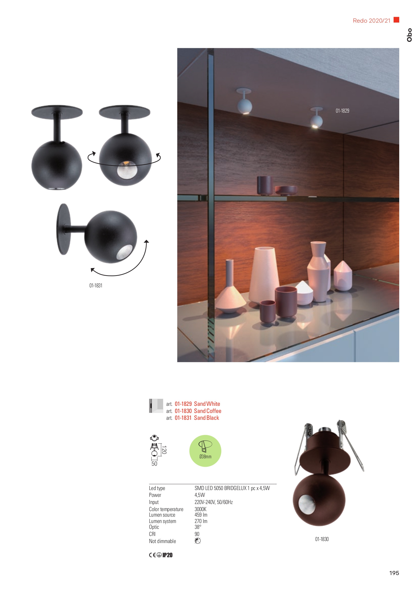 Осветителното тяло 01-1830 ще осигури комфорт и естетика във всяко помещение, в което се постави. Цялостната визия и дизайн на лампата и вложените в изработката й материали, като алуминий в цвят кафе мат, ще допринесат за един неповторим стил. Благодарение на дългогодишния опит, качествените материали и строгия контрол на качеството на изработка на дизайнерската линия Redo Indoor на производителя Redo (Румъния), 01-1830 е на високо европейско ниво.