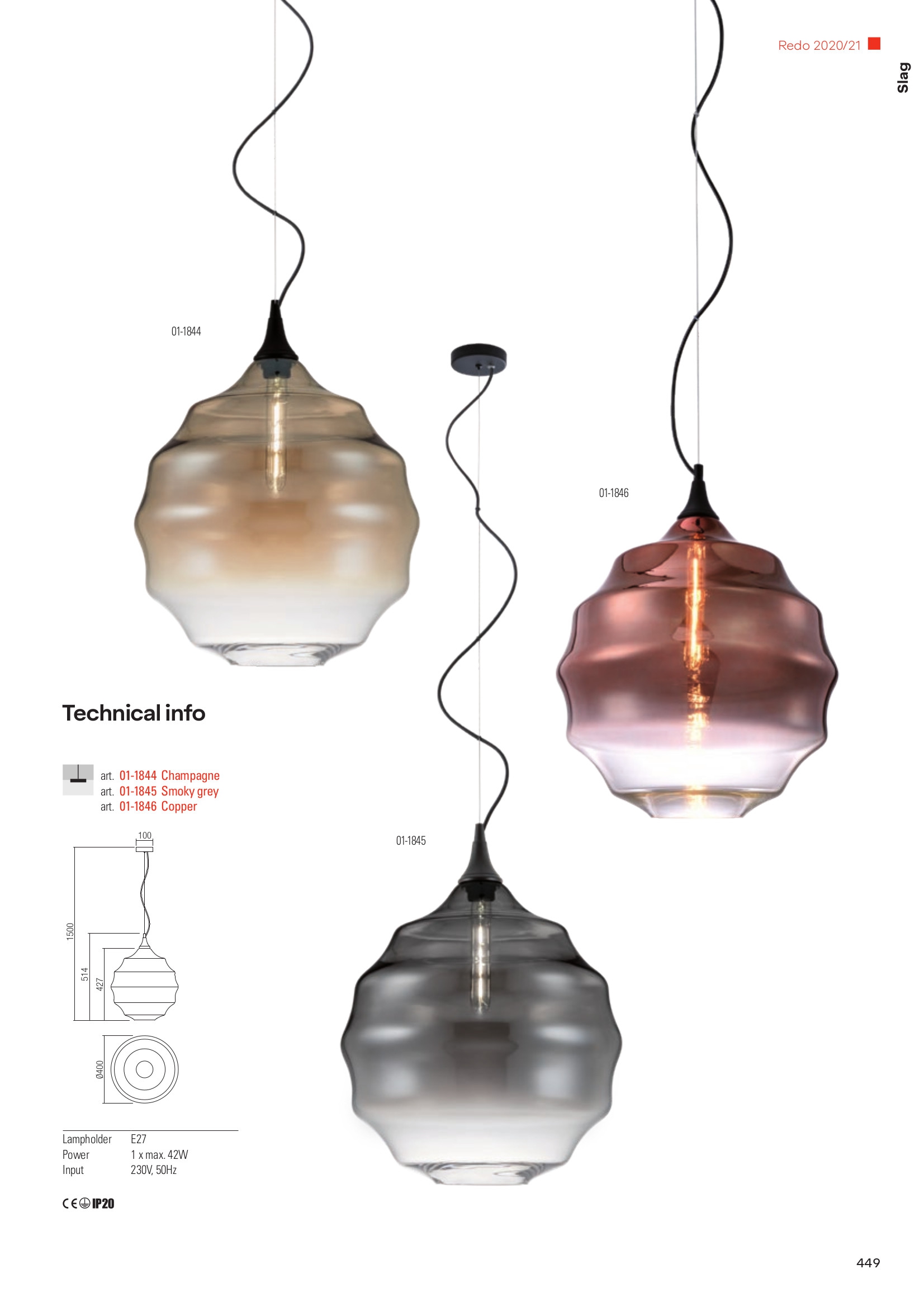 Осветителното тяло ^01-1845 ще осигури комфорт и естетика във всяко помещение, в което се постави. Цялостната визия и дизайн на лампата и вложените в изработката й материали, като метал в цвят черен мат, дифузер от духано стъкло в цвят опушено сиво, ще допринесат за един неповторим стил. Благодарение на дългогодишния опит, качествените материали и строгия контрол на качеството на изработка на дизайнерската линия Redo Indoor на производителя Redo (Румъния), ^01-1845 е на високо европейско ниво.