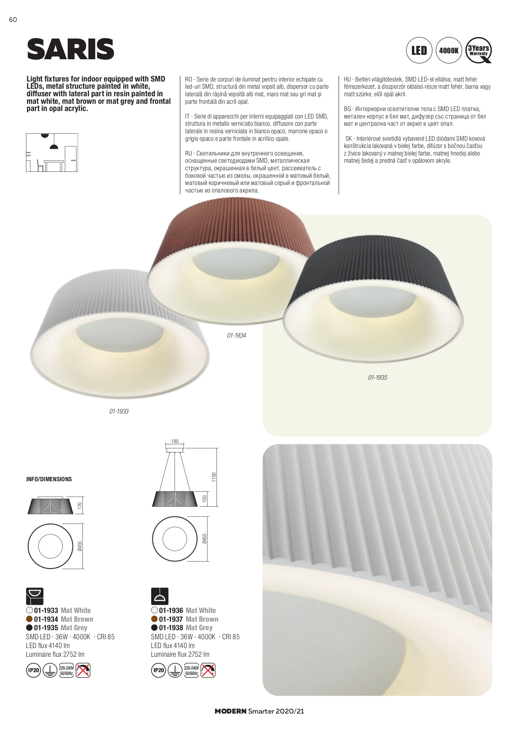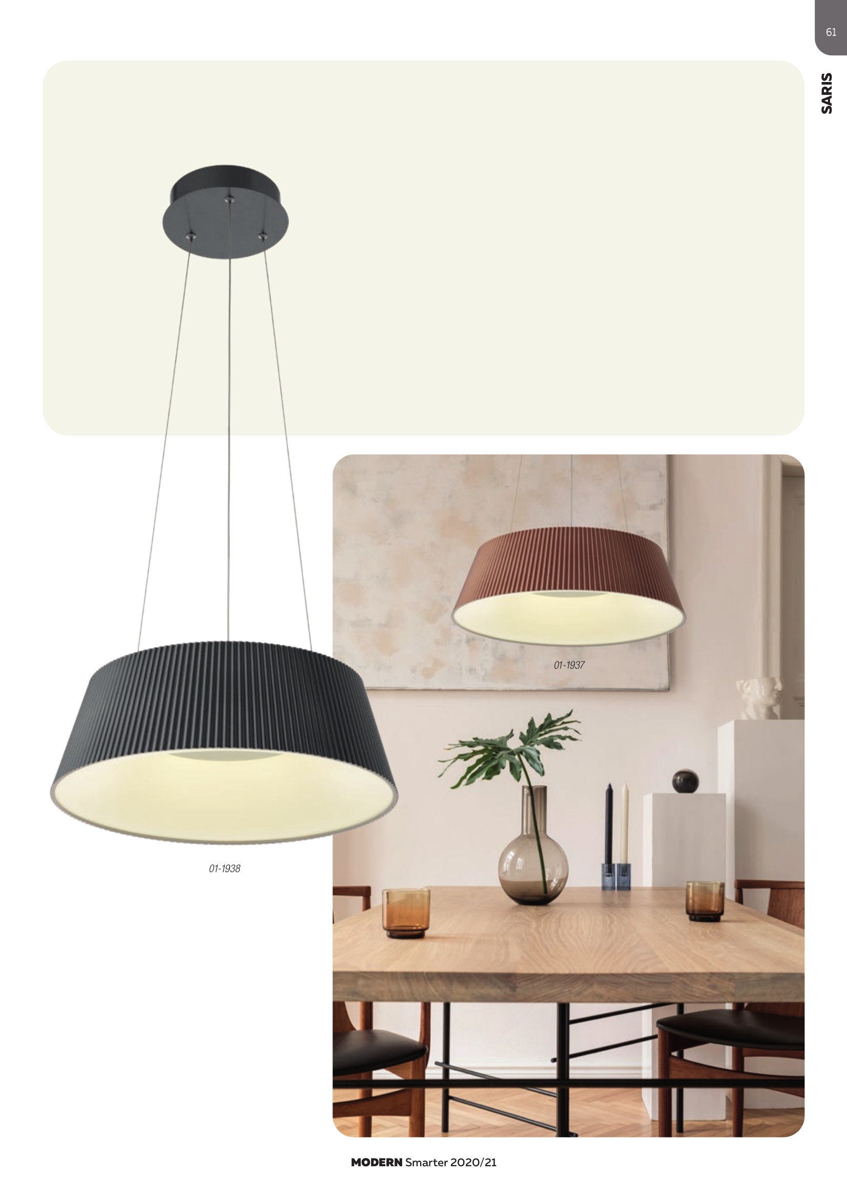 Осветителното тяло 01-1938 ще осигури комфорт и естетика във всяко помещение, в което се постави. Цялостната визия и дизайн на лампата и вложените в изработката й материали, като метал в цвят черен мат, дифузер с централна част от полимер в цвят бял опал и тороидална част в матово бяло, ще допринесат за един неповторим стил. Благодарение на дългогодишния опит, качествените материали и строгия контрол на качеството на изработка на дизайнерската линия Redo Smarter на производителя Redo (Румъния), 01-1938 е на високо европейско ниво.