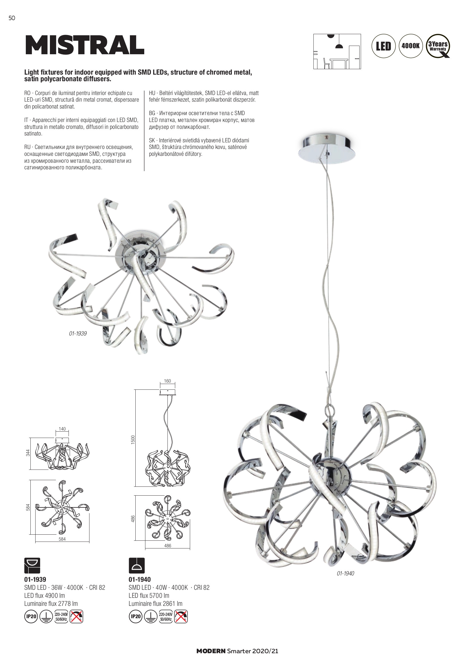 Осветителното тяло 01-1939 ще осигури комфорт и естетика във всяко помещение, в което се постави. Цялостната визия и дизайн на лампата и вложените в изработката й материали, като хромиран метал, дифузер от матово бял полимер, ще допринесат за един неповторим стил. Благодарение на дългогодишния опит, качествените материали и строгия контрол на качеството на изработка на дизайнерската линия Redo Smarter на производителя Redo (Румъния), 01-1939 е на високо европейско ниво.
