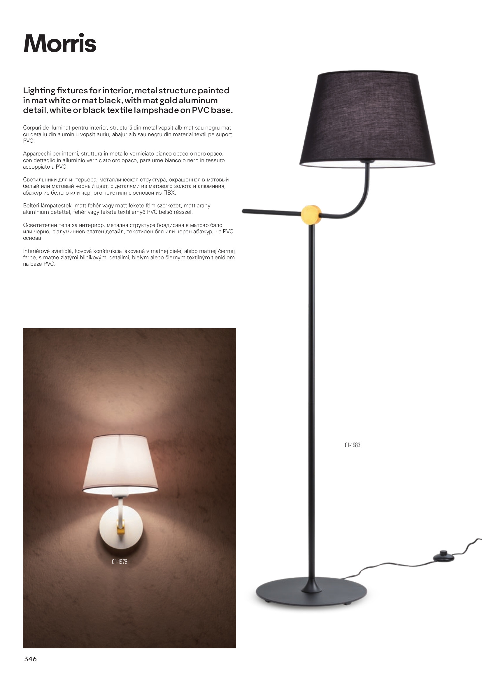 Осветителното тяло 01-1979 ще осигури комфорт и естетика във всяко помещение, в което се постави. Цялостната визия и дизайн на лампата и вложените в изработката й материали, като метал в цвят черен мат, алуминиев детайл в цвят злато, абажур от черен текстил върху полимерна основа, ще допринесат за един неповторим стил. Благодарение на дългогодишния опит, качествените материали и строгия контрол на качеството на изработка на дизайнерската линия Redo Indoor на производителя Redo (Румъния), 01-1979 е на високо европейско ниво.