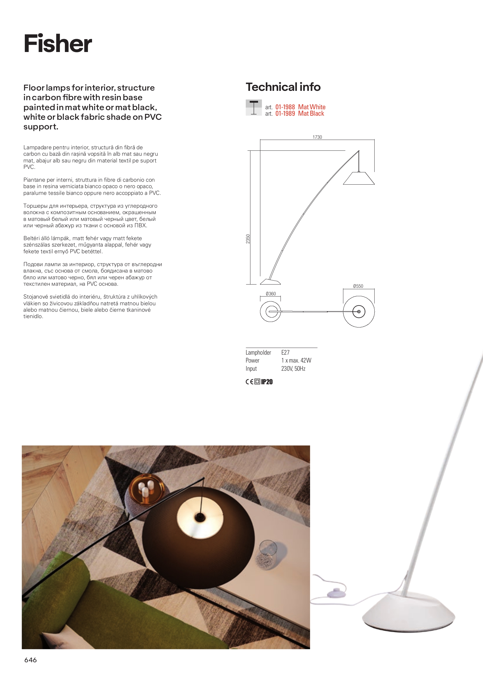 Осветителното тяло 01-1988 ще осигури комфорт и естетика във всяко помещение, в което се постави. Цялостната визия и дизайн на лампата и вложените в изработката й материали, като структура от въглеродни влакна, основа от смола в матово бял цвят, абажур от текстил в бяло върху полимерна основа, ще допринесат за един неповторим стил. Благодарение на дългогодишния опит, качествените материали и строгия контрол на качеството на изработка на дизайнерската линия Redo Indoor на производителя Redo (Румъния), 01-1988 е на високо европейско ниво.