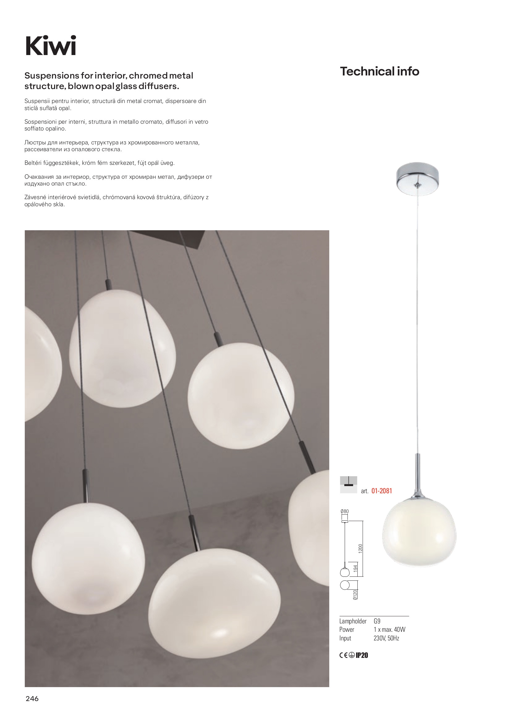Осветителното тяло 01-2081 ще осигури комфорт и естетика във всяко помещение, в което се постави. Цялостната визия и дизайн на лампата и вложените в изработката й материали, като хромиран метал, дифузер от издухано опалово бяло стъкло, ще допринесат за един неповторим стил. Благодарение на дългогодишния опит, качествените материали и строгия контрол на качеството на изработка на дизайнерската линия Redo Indoor на производителя Redo (Румъния), 01-2081 е на високо европейско ниво.