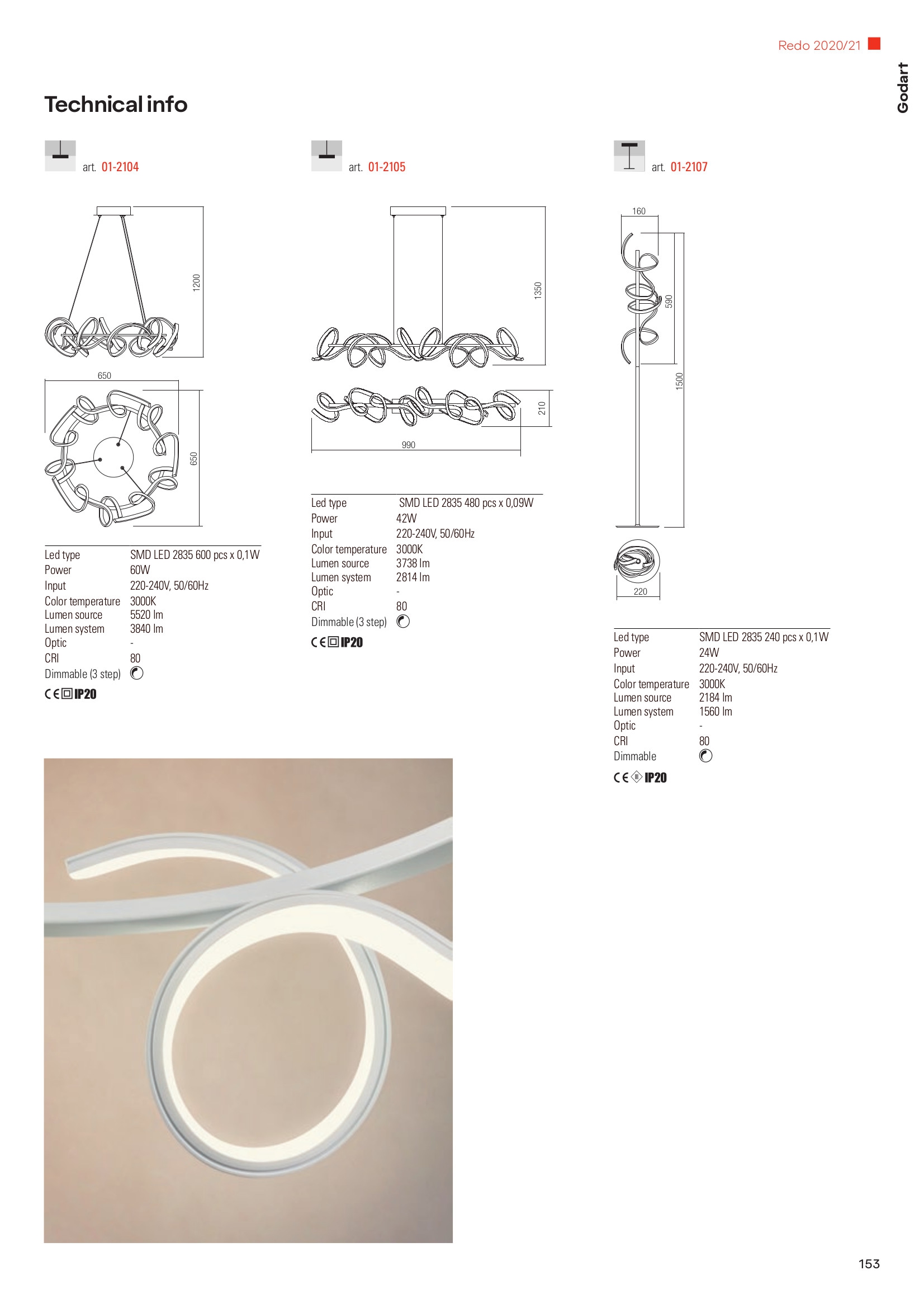 Осветителното тяло 01-2105 ще осигури комфорт и естетика във всяко помещение, в което се постави. Цялостната визия и дизайн на лампата и вложените в изработката й материали, като алуминий в матово бял цвят, дифузер от бял силикон, ще допринесат за един неповторим стил. Благодарение на дългогодишния опит, качествените материали и строгия контрол на качеството на изработка на дизайнерската линия Redo Indoor на производителя Redo (Румъния), 01-2105 е на високо европейско ниво.
