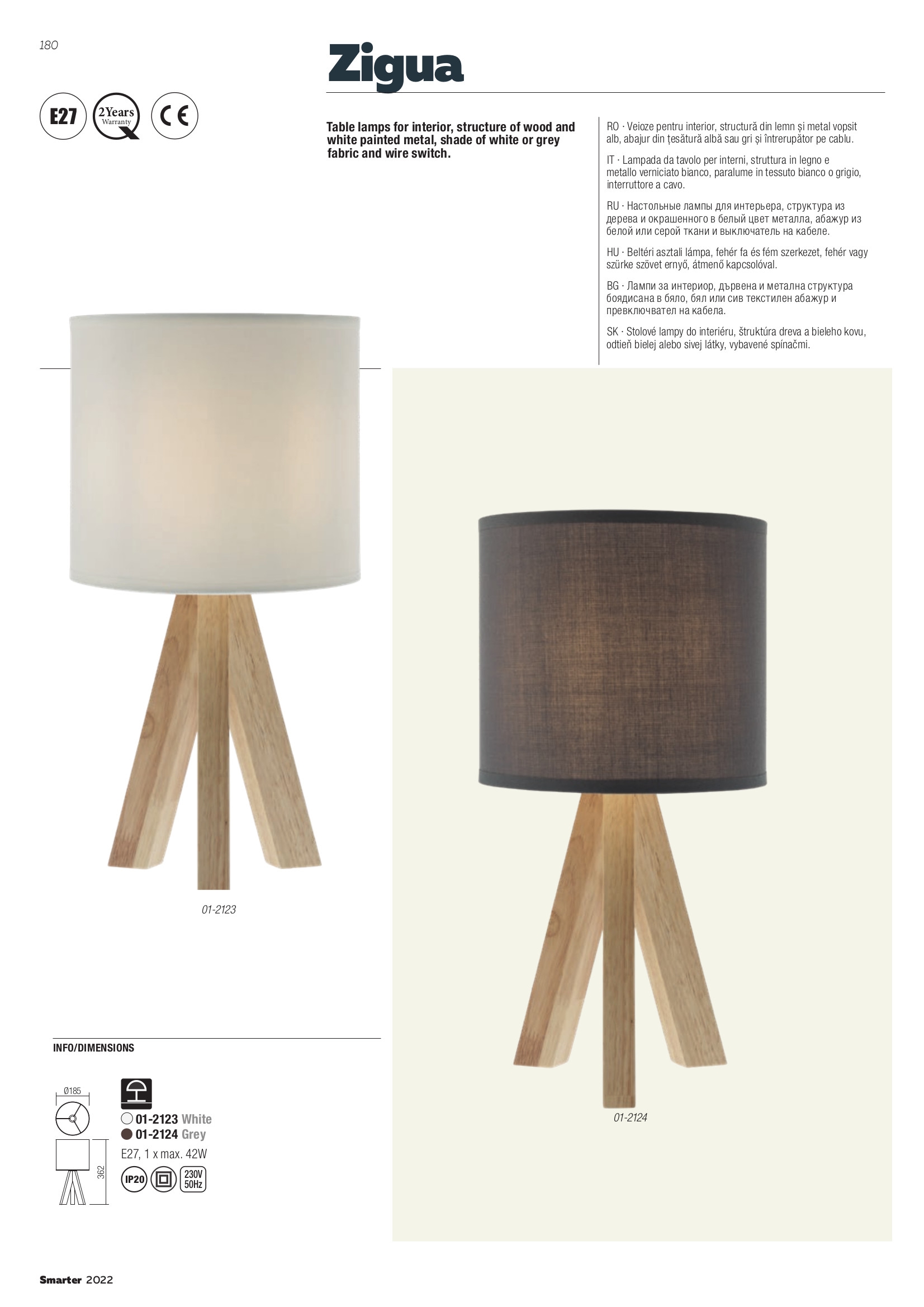 Стилът и естетиката на интериора ще се обогатят благодарение, както на цялостната визия, стил и дизайн на осветителното тяло, така и на вложените от производителя в изработката на 01-2124, качествени материали, като: дърво в естествен цвят, метал в бяло, сив текстилен абажур, ключ ON/OFF.