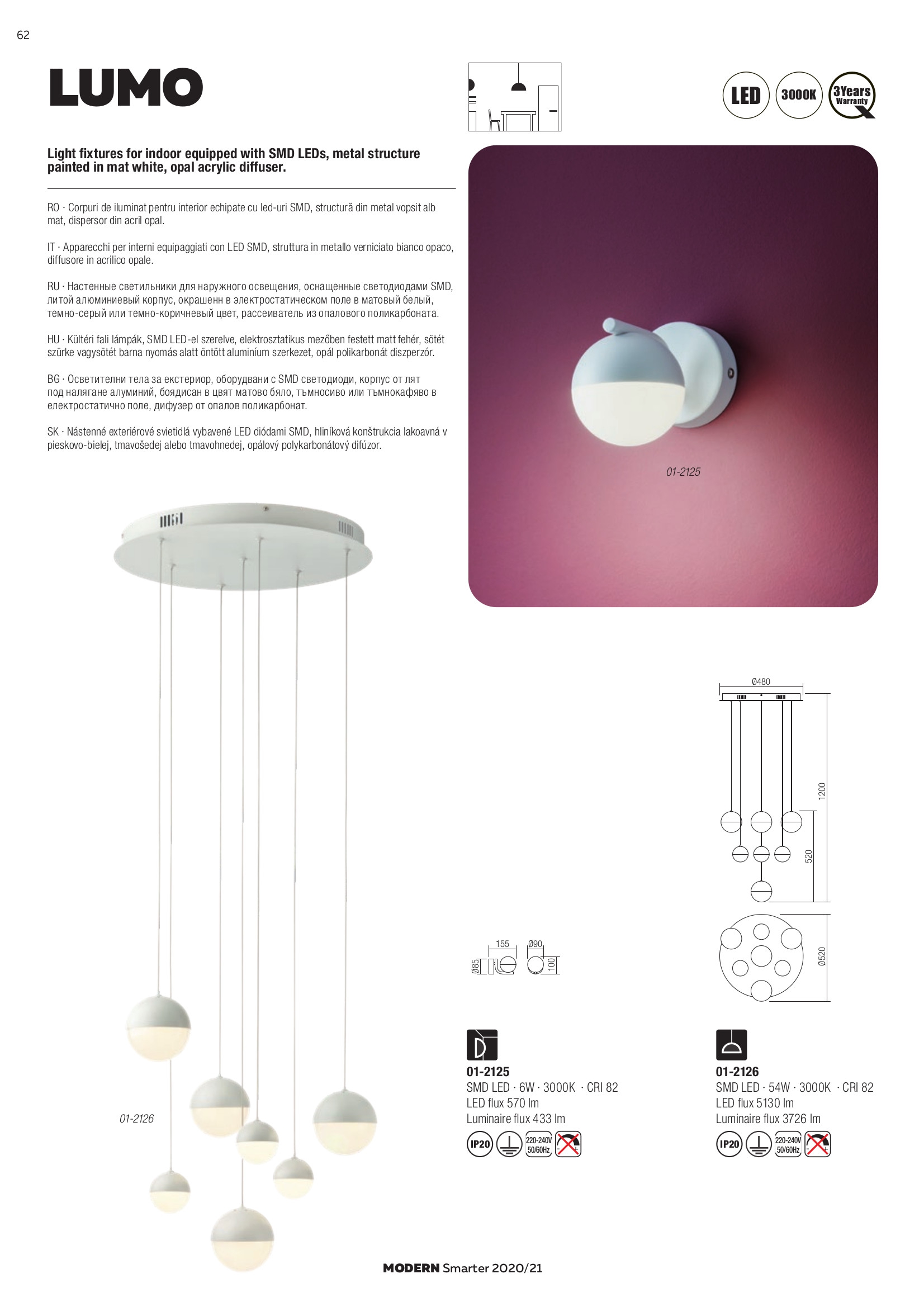 Осветителното тяло 01-2125 ще осигури комфорт и естетика във всяко помещение, в което се постави. Цялостната визия и дизайн на лампата и вложените в изработката й материали, като метал в матово бял цвят, полимер в опалово бяло, ще допринесат за един неповторим стил. Благодарение на дългогодишния опит, качествените материали и строгия контрол на качеството на изработка на дизайнерската линия Redo Smarter на производителя Redo (Румъния), 01-2125 е на високо европейско ниво.