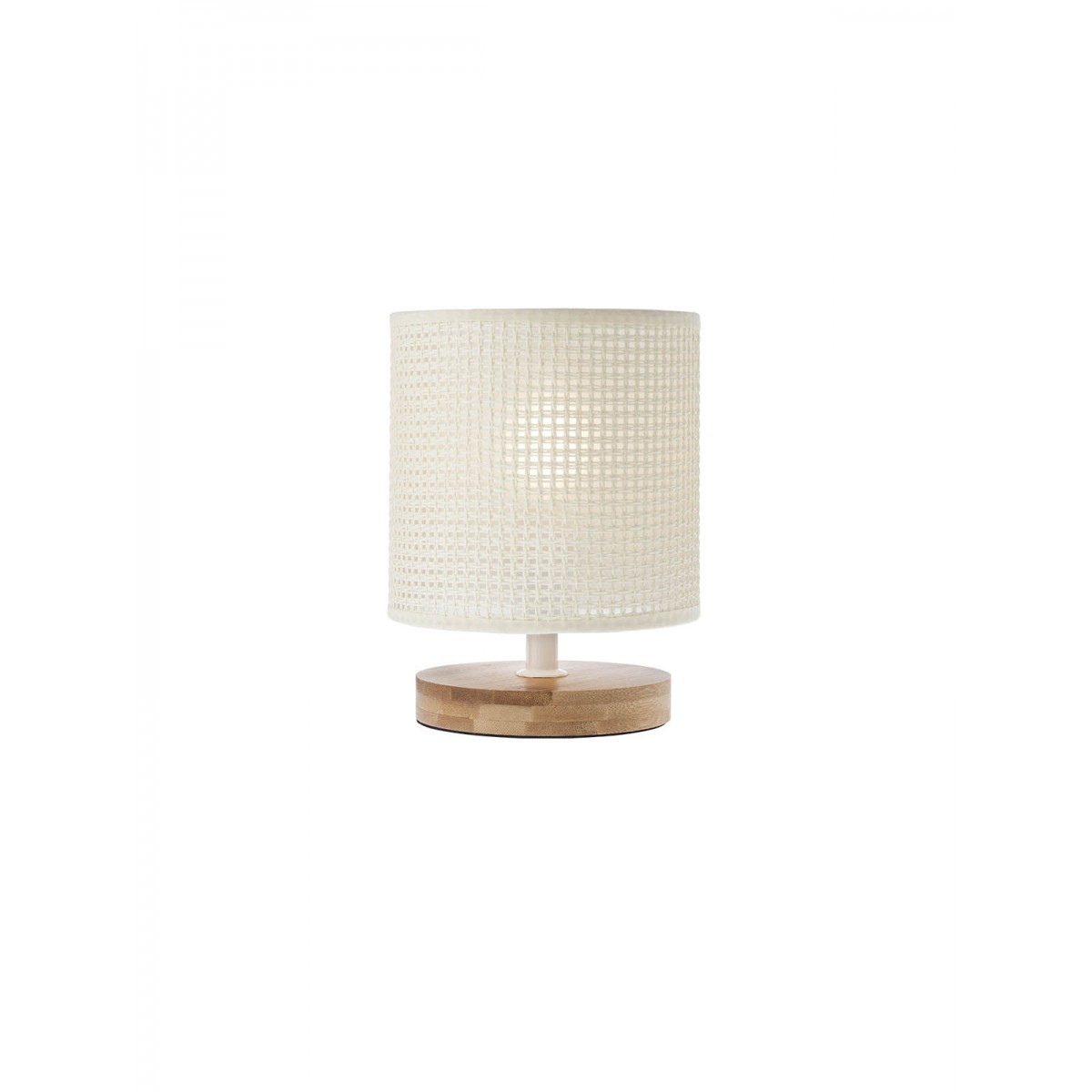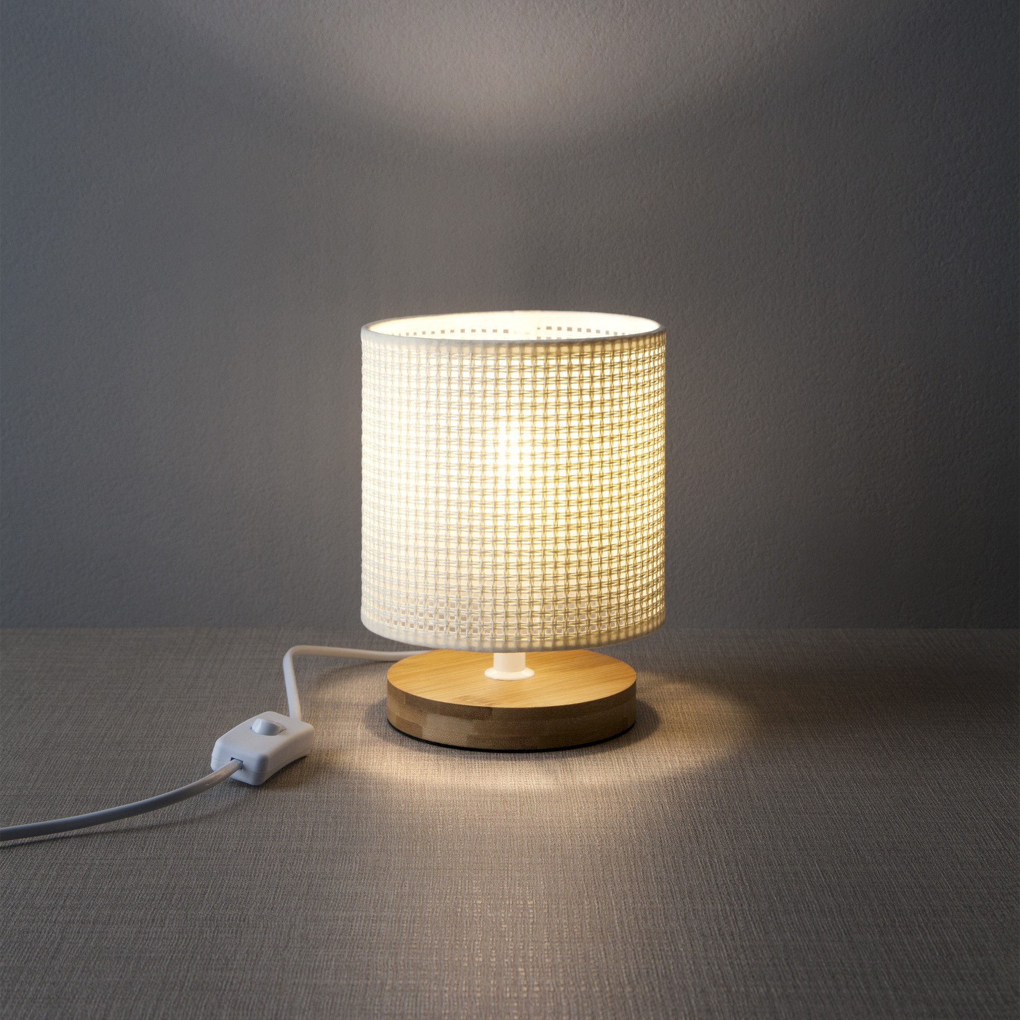 дърво в естествен цвят, метал в бяло, шапка от текстил в светло бежово, ключ ON/OFF