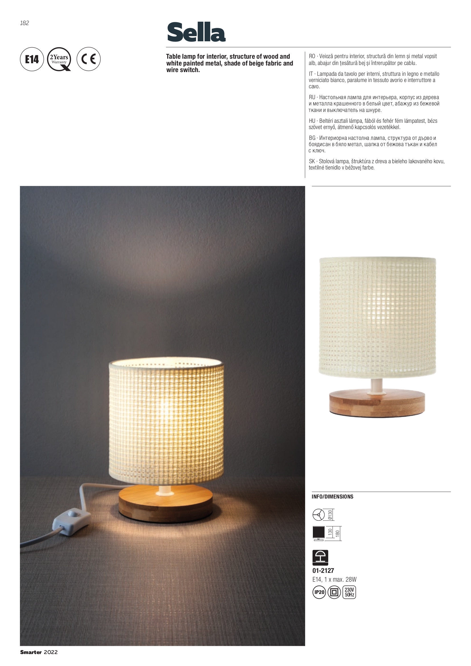 Стилът и естетиката на интериора ще се обогатят благодарение, както на цялостната визия, стил и дизайн на осветителното тяло, така и на вложените от производителя в изработката на 01-2127, качествени материали, като: дърво в естествен цвят, метал в бяло, шапка от текстил в светло бежово, ключ ON/OFF.