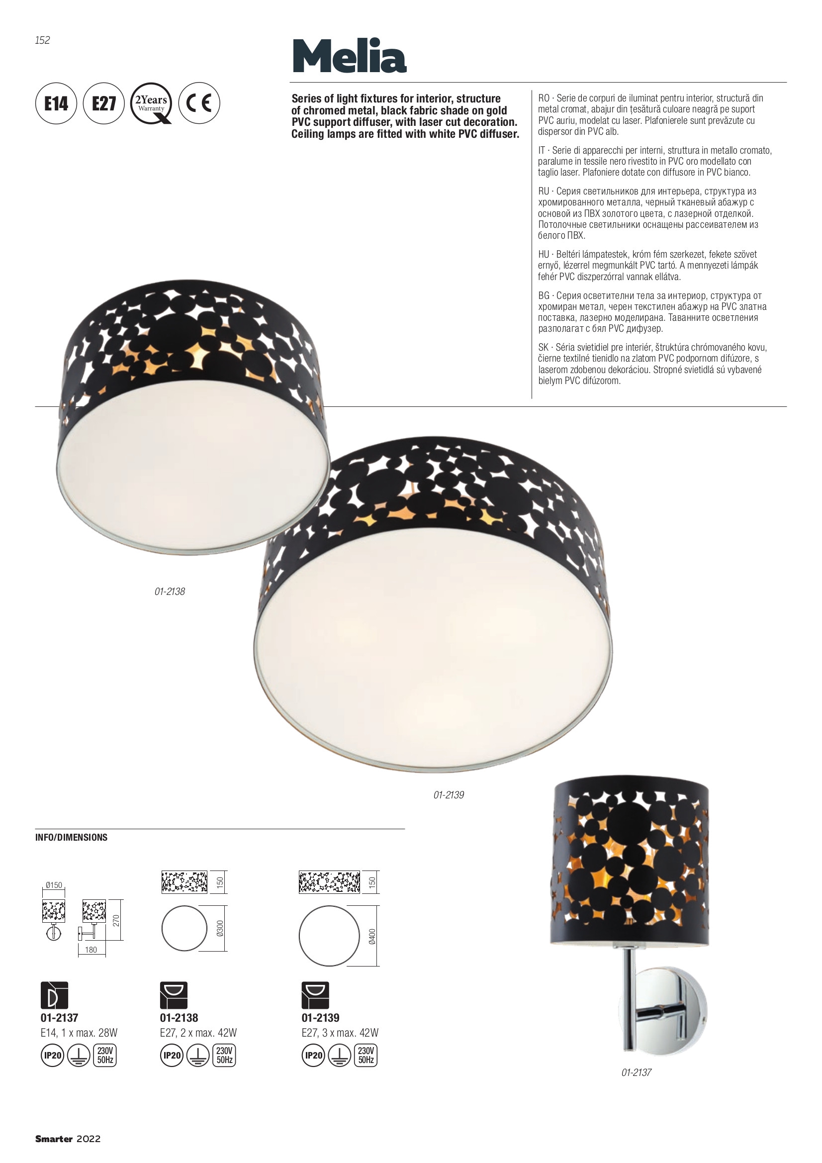 Осветителното тяло 01-2140 ще осигури комфорт и естетика във всяко помещение, в което се постави. Цялостната визия и дизайн на лампата и вложените в изработката й материали, като хромиран метал, абажур от черен текстил поставен на PVC подложка в цвят злато, лазарно моделирана, ще допринесат за един неповторим стил. Благодарение на дългогодишния опит, качествените материали и строгия контрол на качеството на изработка на дизайнерската линия Redo Smarter на производителя Redo (Румъния), 01-2140 е на високо европейско ниво.