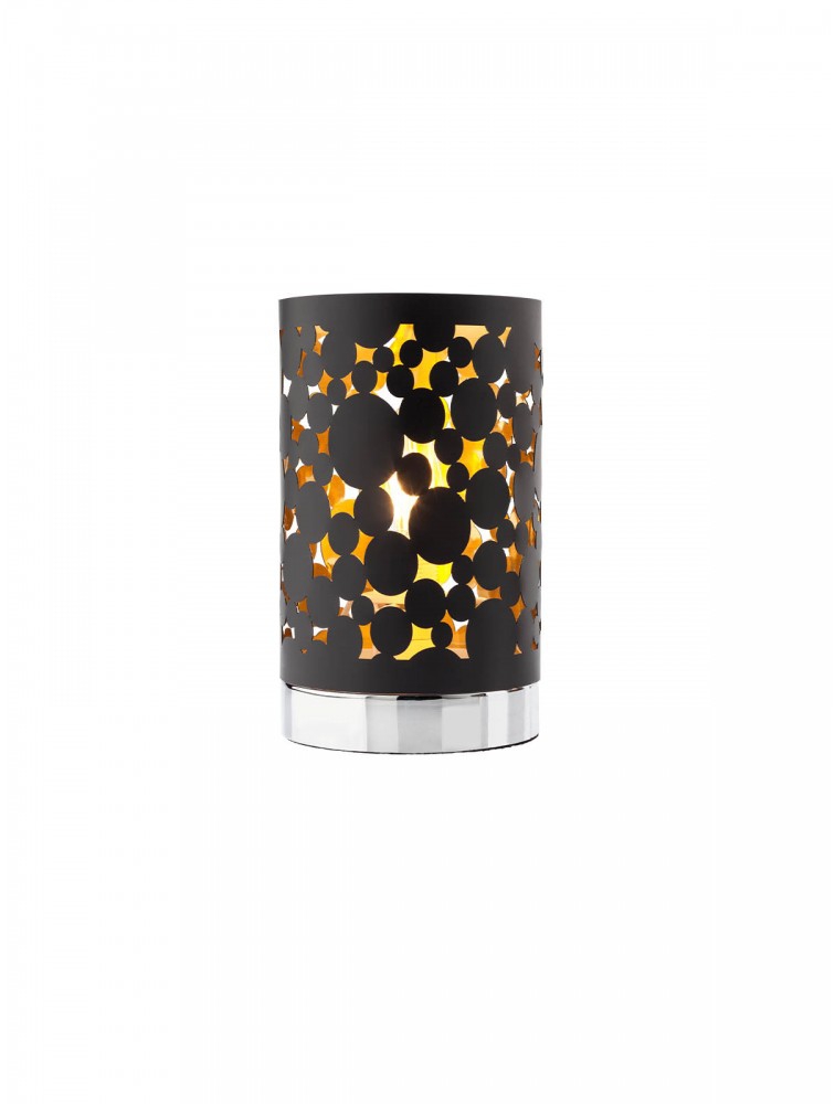 хромиран метал, абажур от черен текстил поставен на PVC подложка в цвят злато, лазарно моделирана