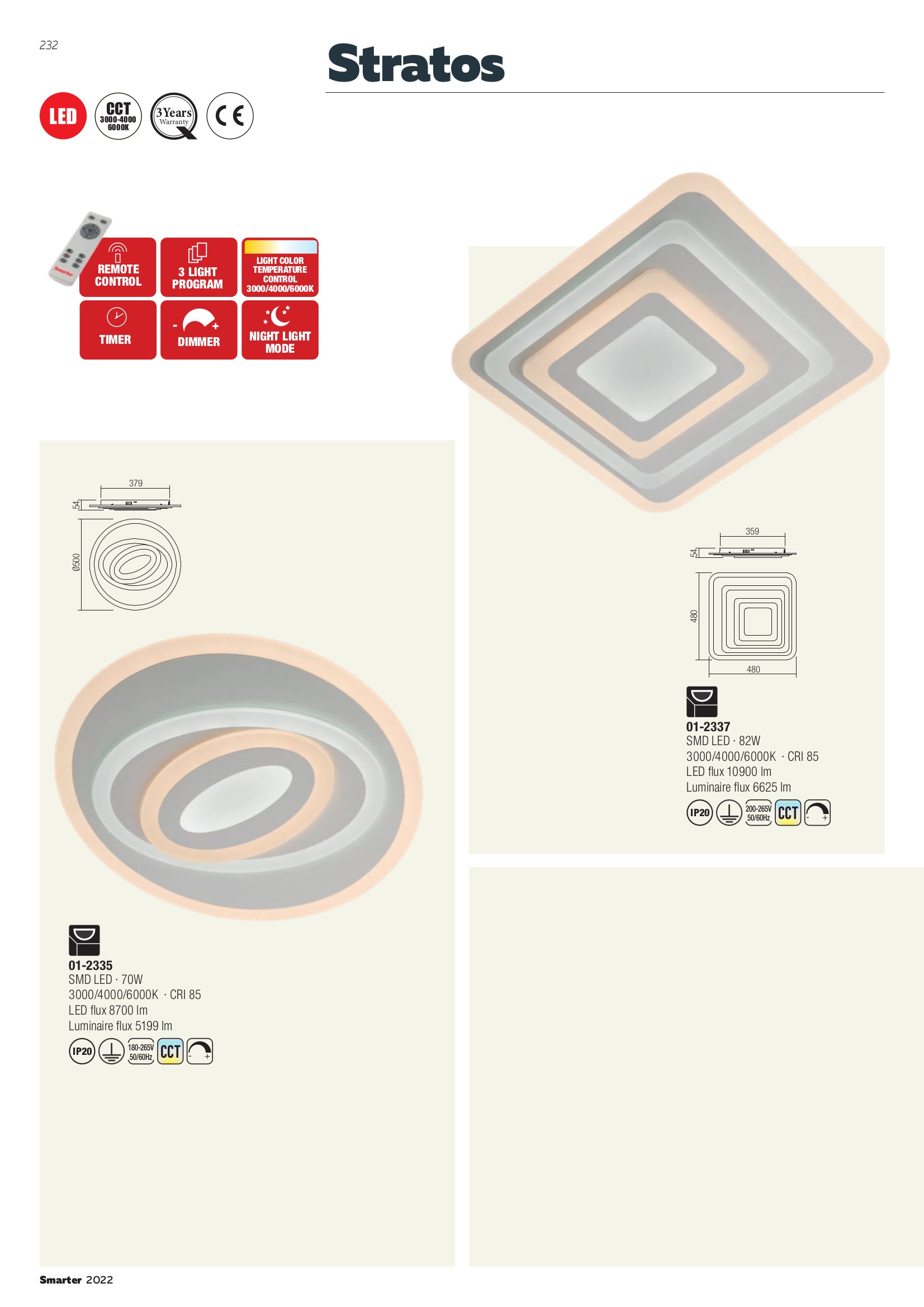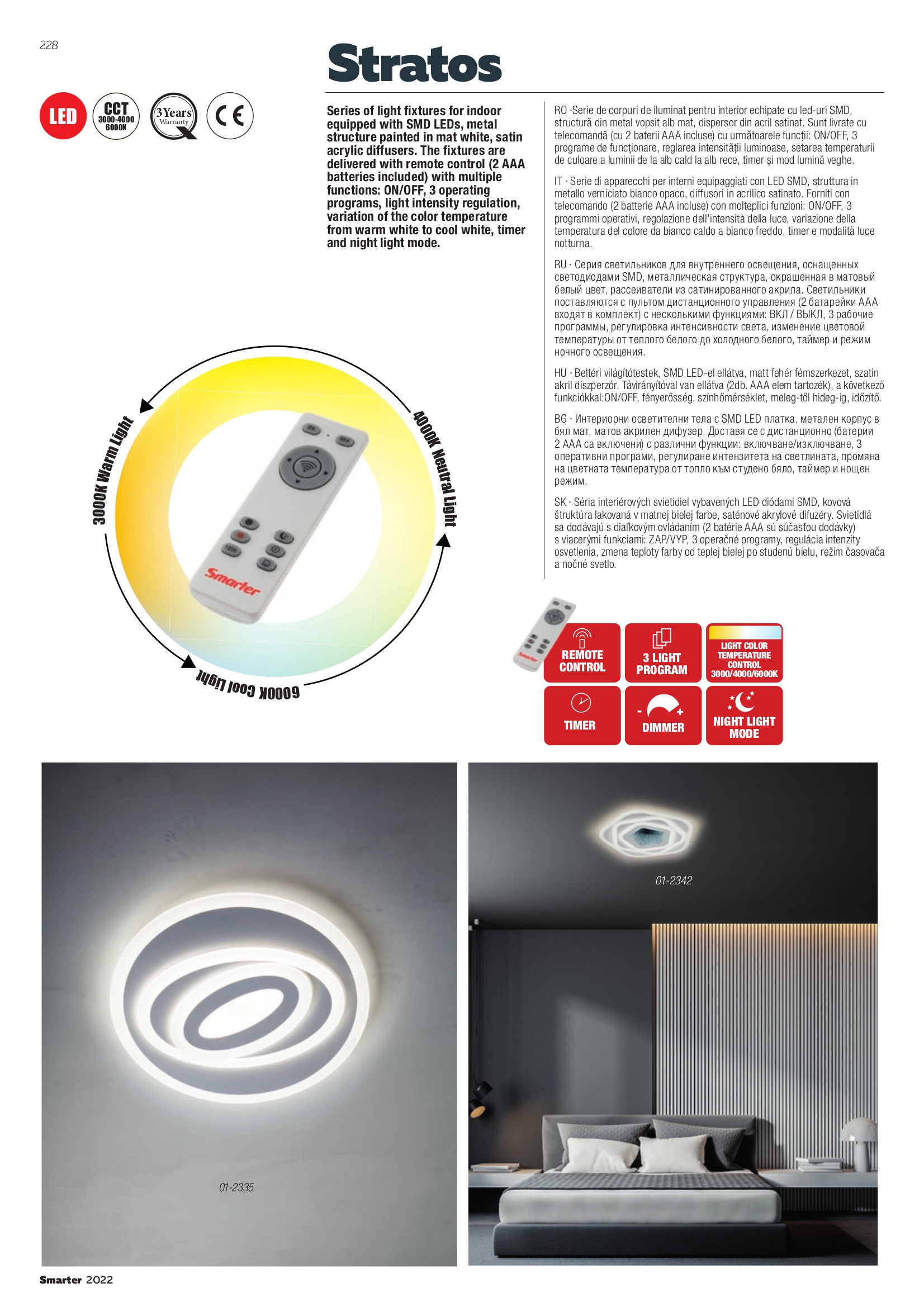 Лед плафон 01-2335 ще осигури комфорт и естетика във всяко помещение, в което се постави. Цялостната визия и дизайн на led лампата и вложените в изработката й материали, като метал в матово бяло, сатенирани акрилни разсейватели, дистанционно управление (включени 2 AAA батерии), регулиране на интензитета на светлината, промяна на цветовата температура, таймер, режим нощна светлина, ще допринесат за един неповторим стил. Благодарение на дългогодишния опит в производството на лед осветление, качествените материали и строгия контрол на качеството на изработка на дизайнерската линия Redo Smarter на производителя Redo (Румъния), 01-2335 е на високо европейско ниво.