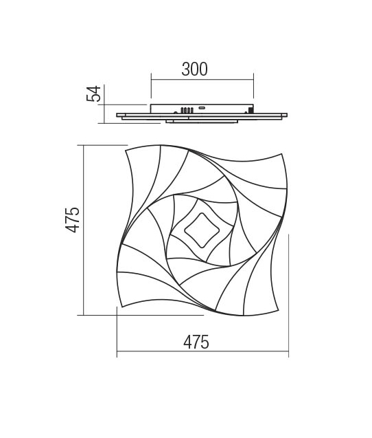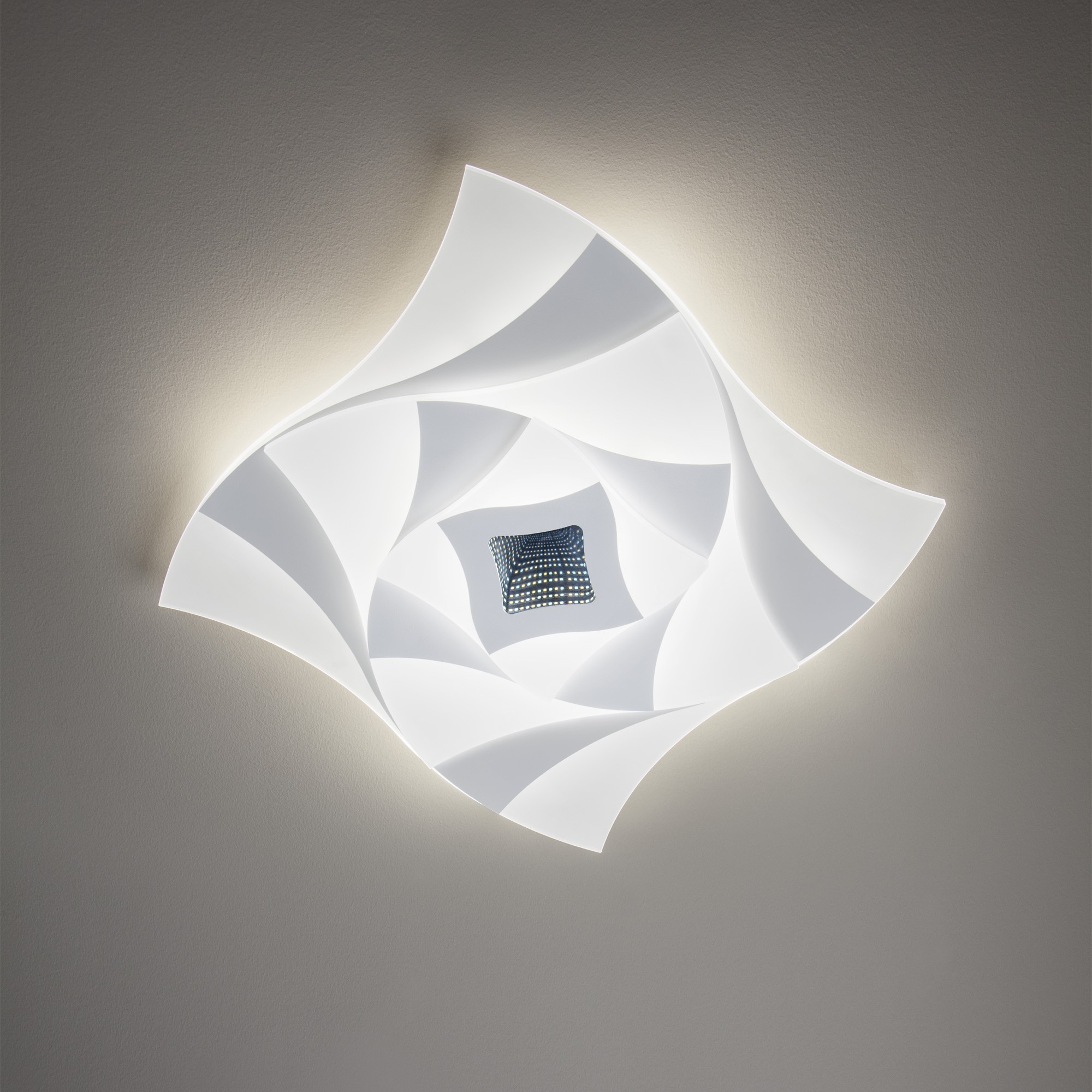 метал в матово бяло, сатенирани акрилни разсейватели, дистанционно управление (включени 2 AAA батерии), регулиране на интензитета на светлината, промяна на цветовата температура, 3D тунелен ефект, таймер, режим нощна светлина