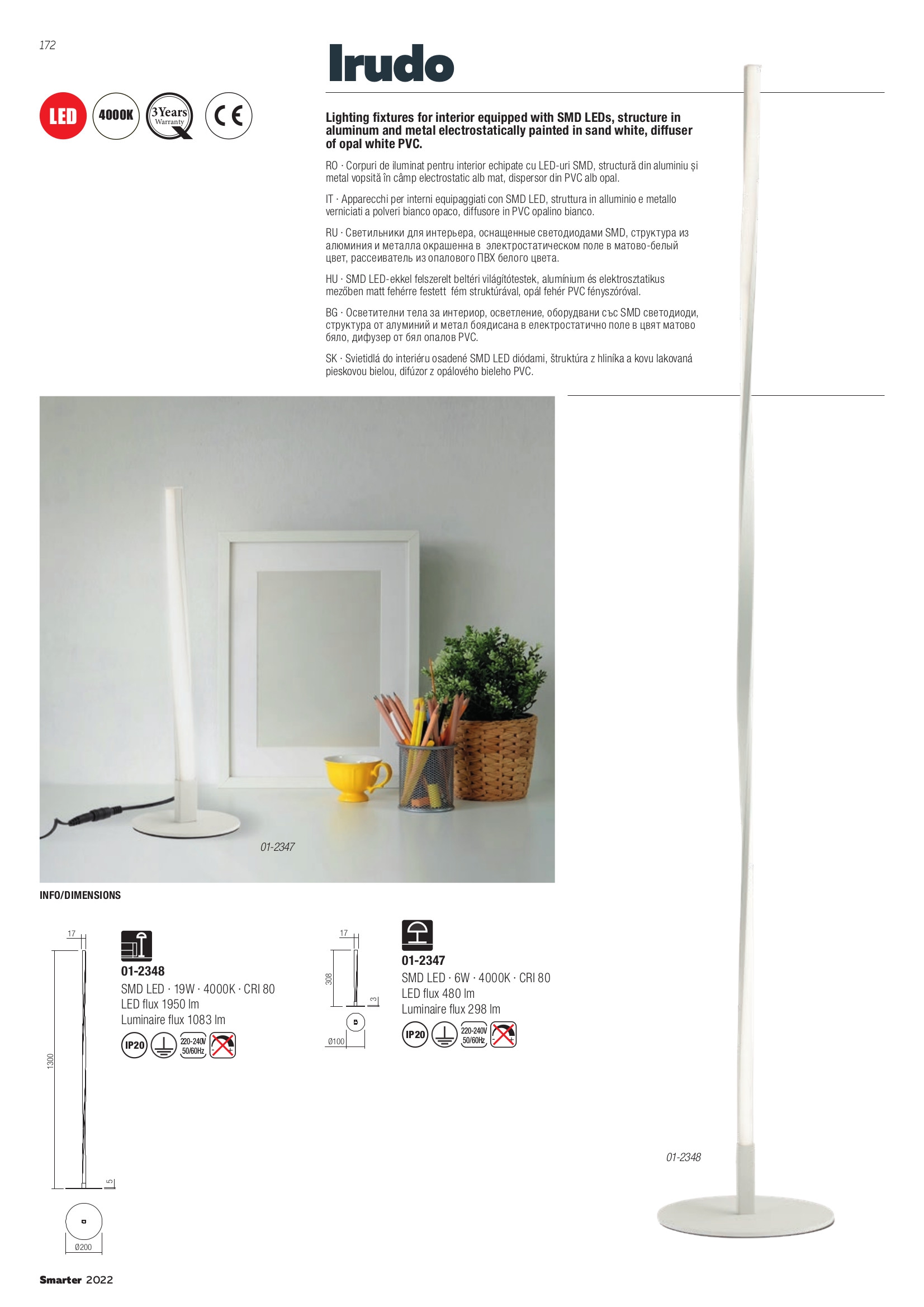 Лед настолна лампа 01-2347 ще осигури комфорт и естетика във всяко помещение, в което се постави. Цялостната визия и дизайн на led лампата и вложените в изработката й материали, като алуминий и метал с матово бяло покритие нанесено в електростатично поле, дифузер от опалово бял полимер , ще допринесат за един неповторим стил. Благодарение на дългогодишния опит в производството на лед осветление, качествените материали и строгия контрол на качеството на изработка на дизайнерската линия Redo Smarter на производителя Redo (Румъния), 01-2347 е на високо европейско ниво.