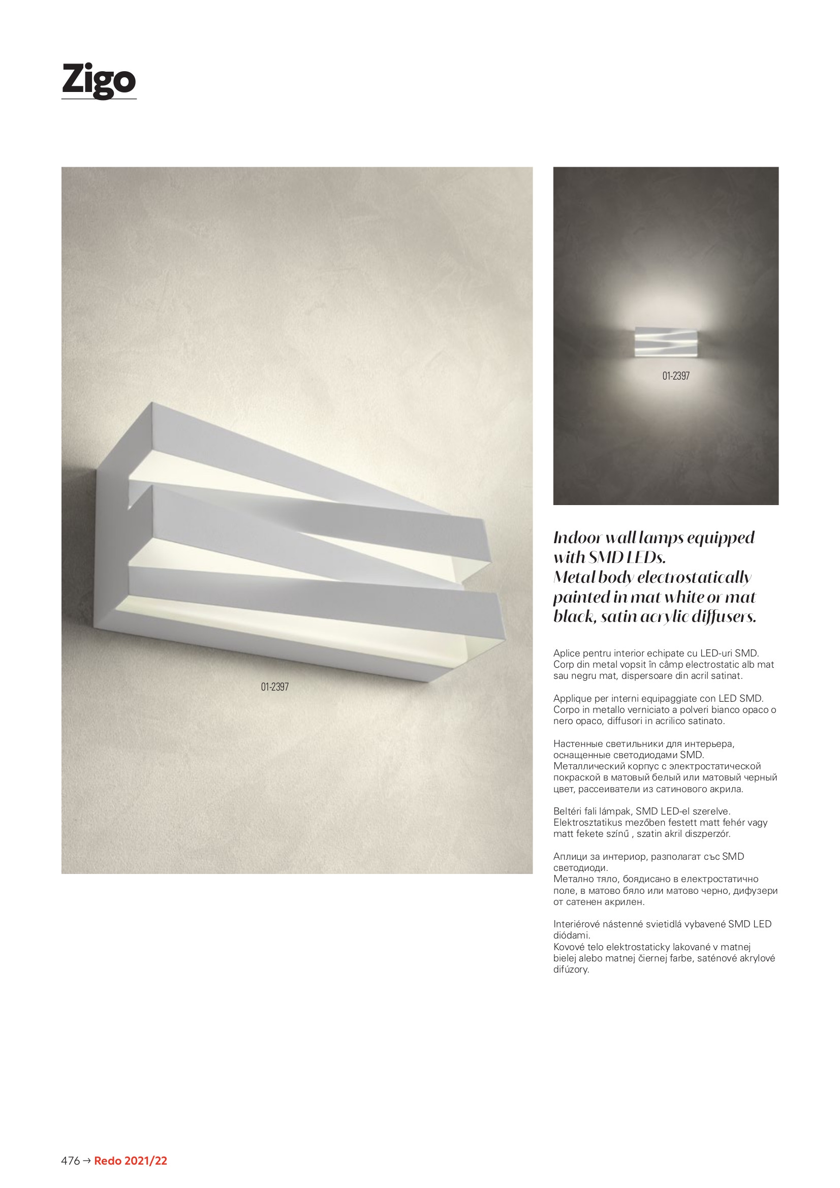 Осветителното тяло 01-2391 представлява аплик в съвременен, дизайнерски стил. 01-2391 е от категорията осветителни тела и е подходящо за осветяване на различни помещения и пространства като: всекидневна / хол, спалня, кухня, трапезария, коридор, антре, стълбище, офис.