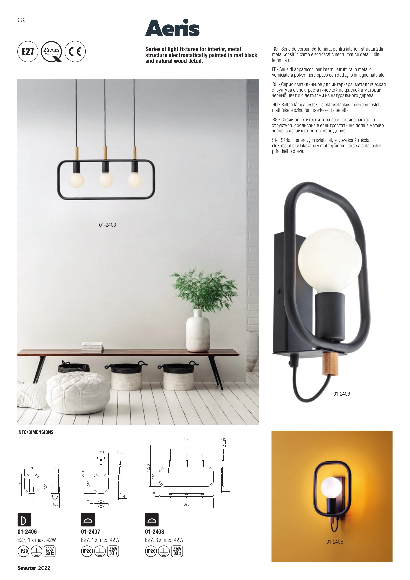 Осветителното тяло 01-2406 ще осигури комфорт и естетика във всяко помещение, в което се постави. Цялостната визия и дизайн на лампата и вложените в изработката й материали, като метал в цвят черен мат, детайл от естествено дърво, ще допринесат за един неповторим стил. Благодарение на дългогодишния опит, качествените материали и строгия контрол на качеството на изработка на дизайнерската линия Redo Smarter на производителя Redo (Румъния), 01-2406 е на високо европейско ниво.