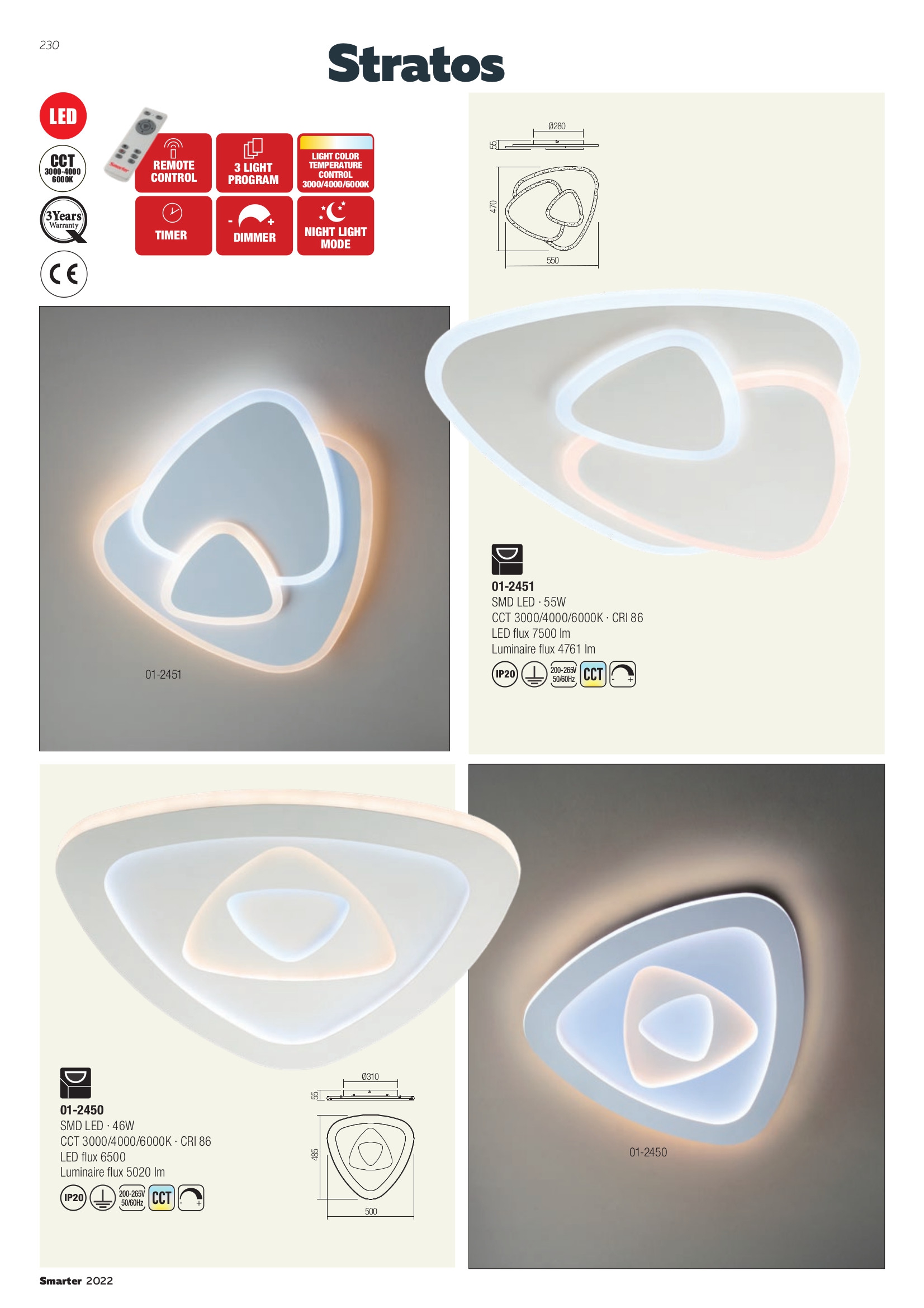 Осветителното тяло 01-2450 ще осигури комфорт и естетика във всяко помещение, в което се постави. Цялостната визия и дизайн на лампата и вложените в изработката й материали, като метал в матово бяло, сатенирани акрилни разсейватели, дистанционно управление (включени 2 AAA батерии), регулиране на интензитета на светлината, промяна на цветовата температура, таймер, режим нощна светлина, ще допринесат за един неповторим стил. Благодарение на дългогодишния опит, качествените материали и строгия контрол на качеството на изработка на дизайнерската линия Redo Smarter на производителя Redo (Румъния), 01-2450 е на високо европейско ниво.