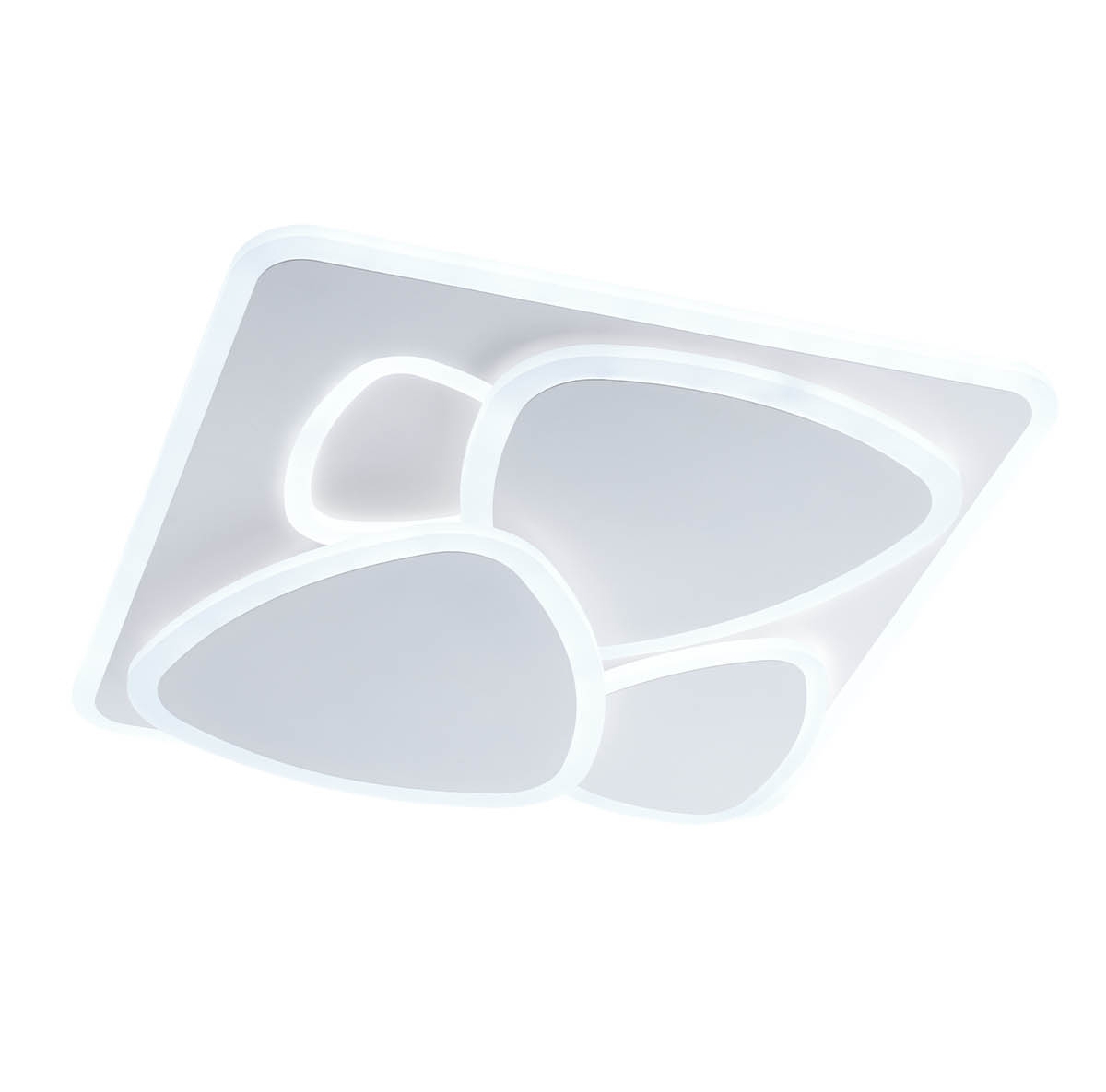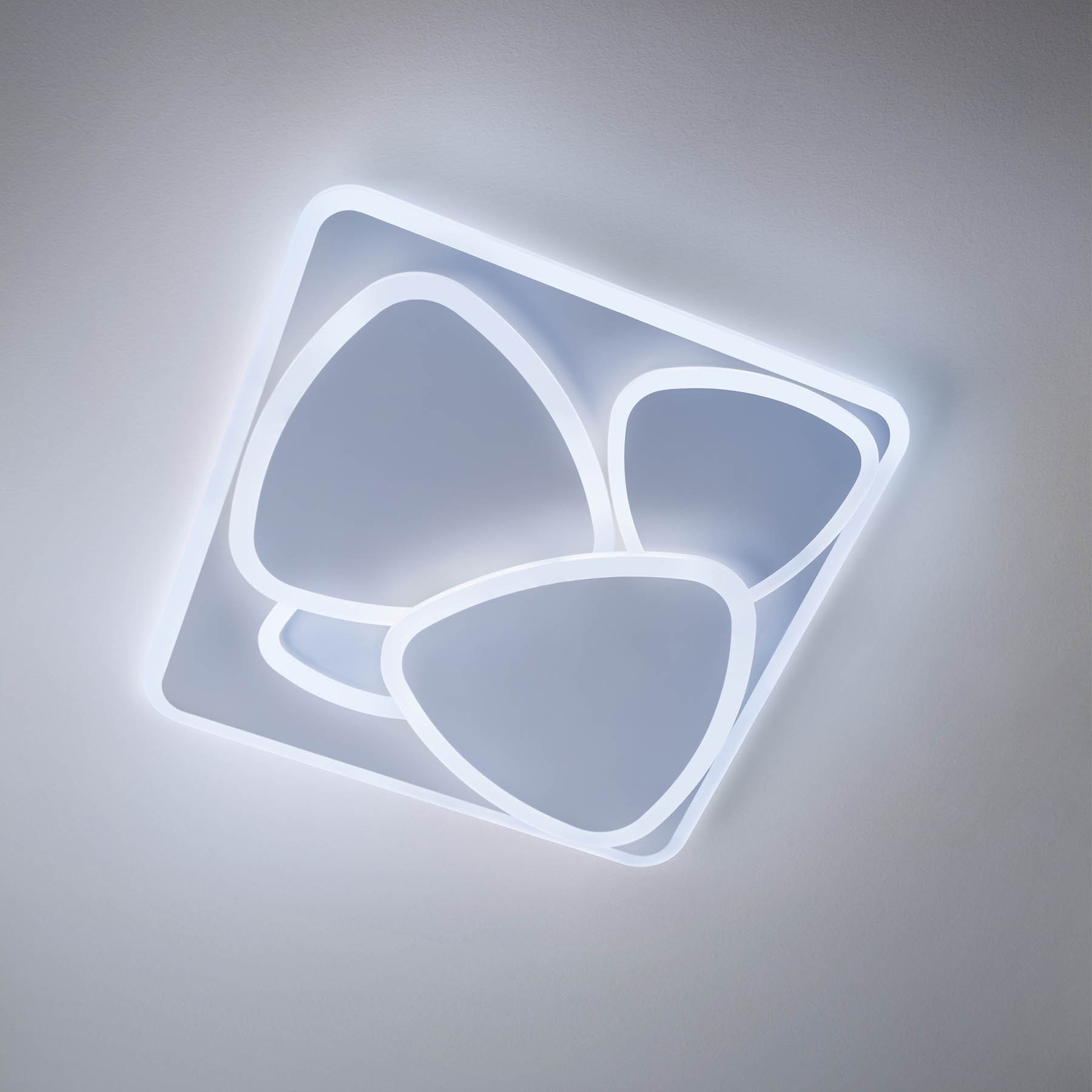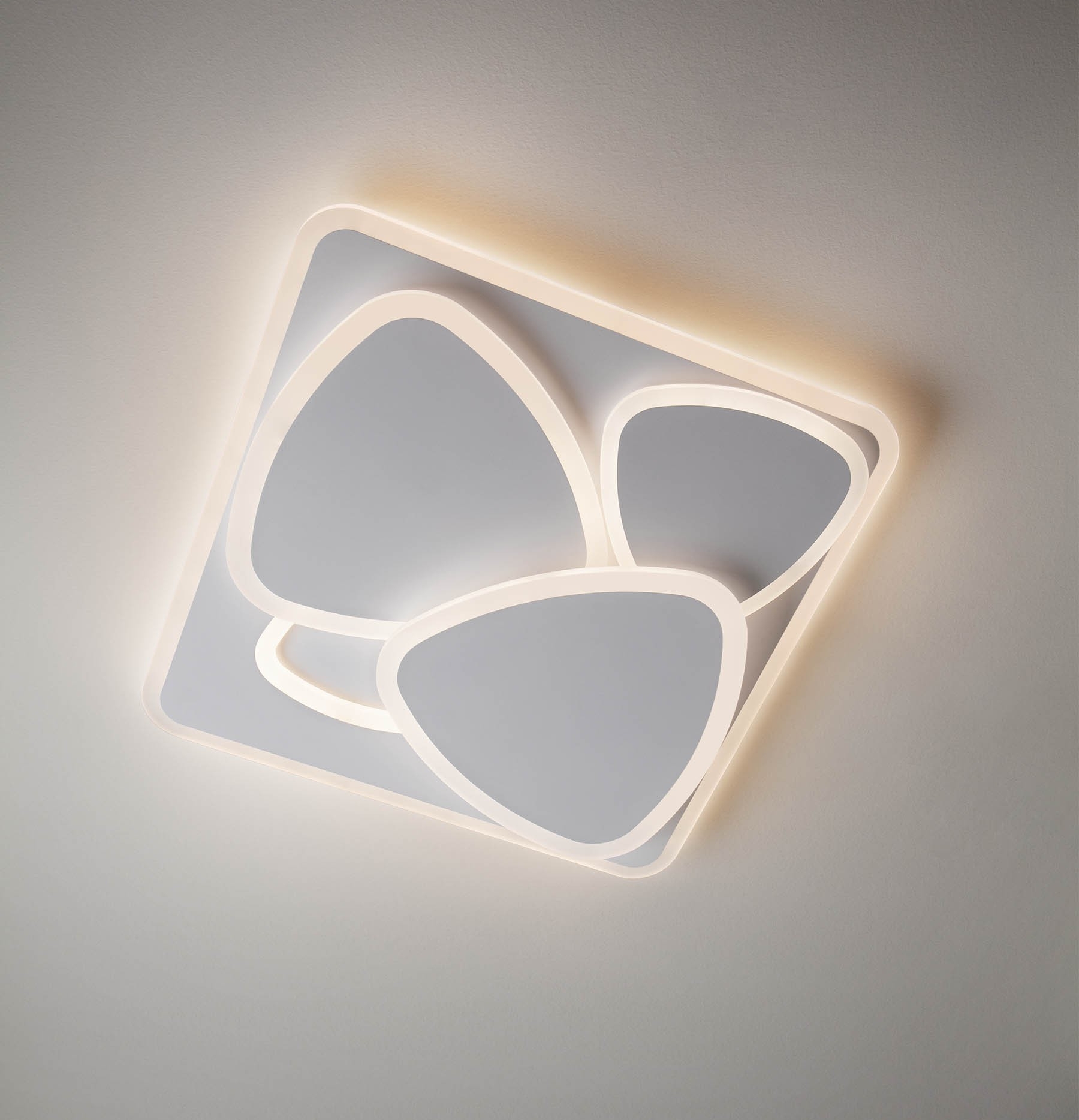 метал в матово бяло, сатенирани акрилни разсейватели, дистанционно управление (включени 2 AAA батерии), регулиране на интензитета на светлината, промяна на цветовата температура, таймер, режим нощна светлина