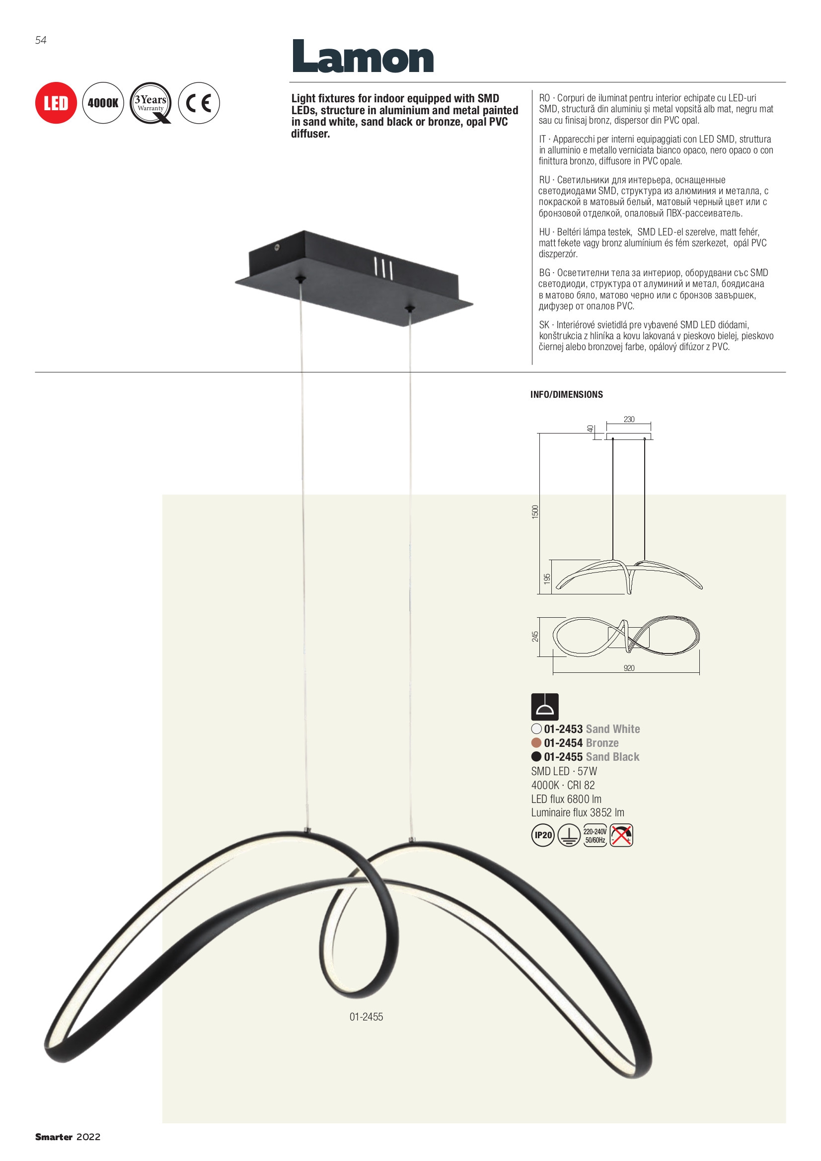 Осветителното тяло 01-2453 ще осигури комфорт и естетика във всяко помещение, в което се постави. Цялостната визия и дизайн на лампата и вложените в изработката й материали, като метал и алуминий в бял мат, дифузьор от опалово бял полимер, ще допринесат за един неповторим стил. Благодарение на дългогодишния опит, качествените материали и строгия контрол на качеството на изработка на дизайнерската линия Redo Smarter на производителя Redo (Румъния), 01-2453 е на високо европейско ниво.