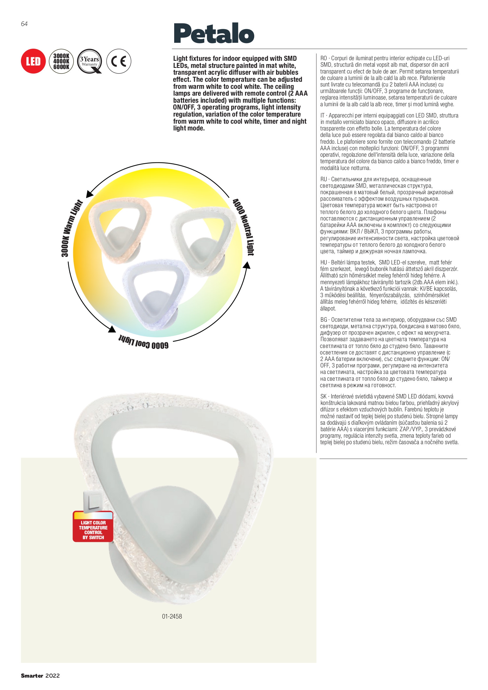 Осветителното тяло 01-2458 ще осигури комфорт и естетика във всяко помещение, в което се постави. Цялостната визия и дизайн на лампата и вложените в изработката й материали, като метал в цвят бял мат, дифузер от прозрачен полимер с ефект мехурчета, дистанционно регулиращо силата и цветната температура на светлината с таймер и нощна светлина, ще допринесат за един неповторим стил. Благодарение на дългогодишния опит, качествените материали и строгия контрол на качеството на изработка на дизайнерската линия Redo Smarter на производителя Redo (Румъния), 01-2458 е на високо европейско ниво.