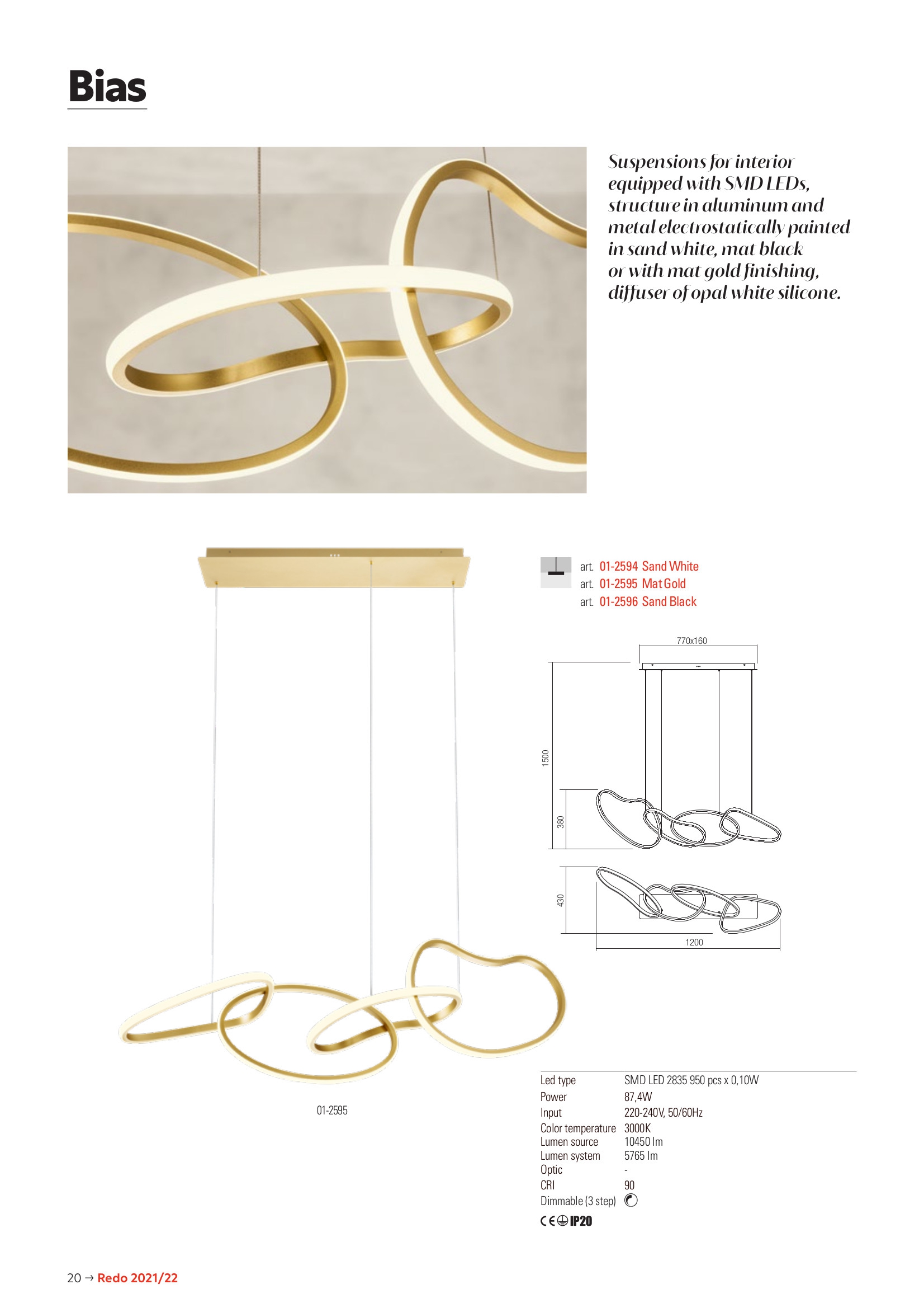 Осветителното тяло 01-2595 ще осигури комфорт и естетика във всяко помещение, в което се постави. Цялостната визия и дизайн на лампата и вложените в изработката й материали, като алуминий в цвят матово злато, дифузер от опалово бял силикон, ще допринесат за един неповторим стил. Благодарение на дългогодишния опит, качествените материали и строгия контрол на качеството на изработка на дизайнерската линия Redo Indoor на производителя Redo (Румъния), 01-2595 е на високо европейско ниво.