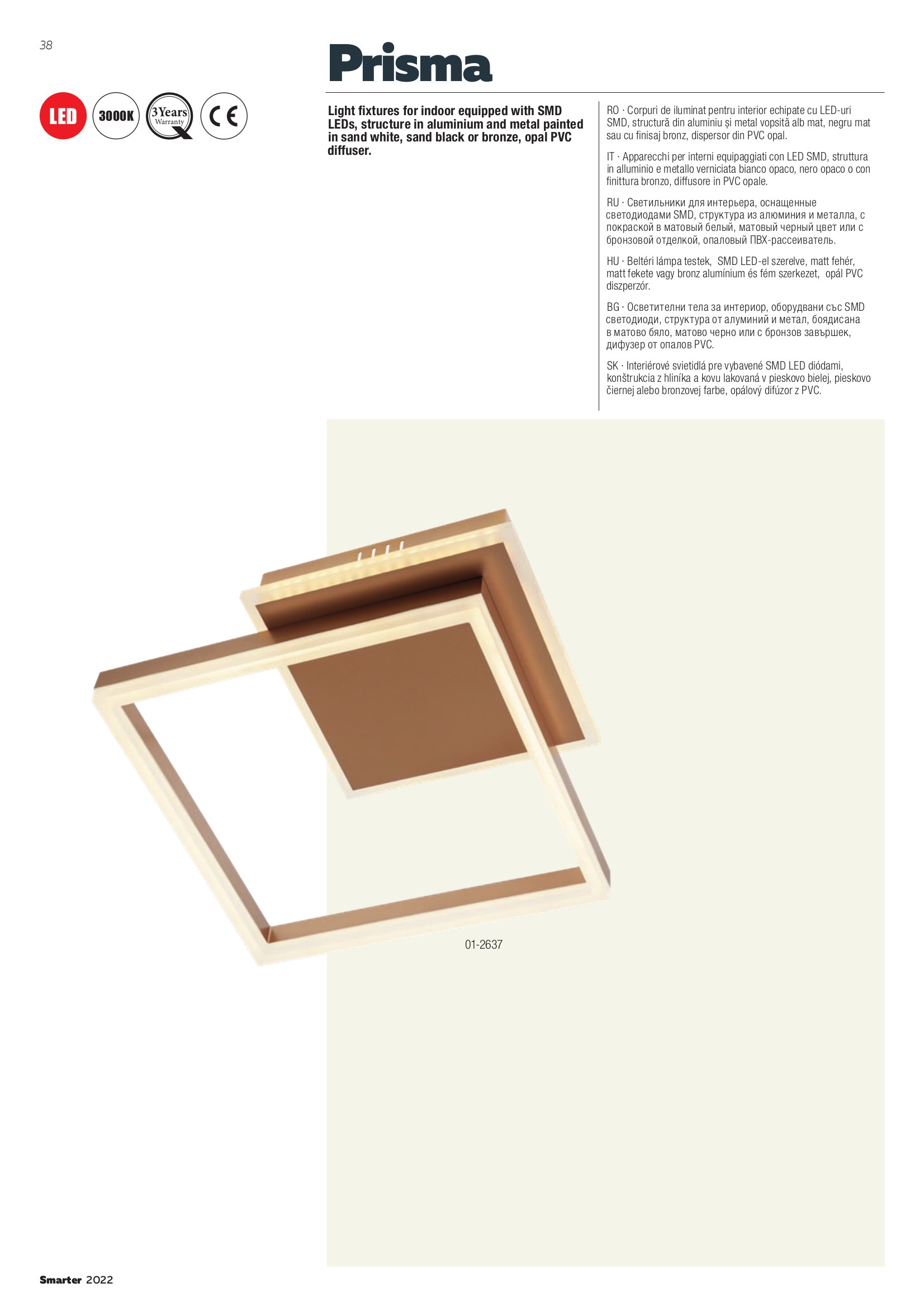 Лед плафон 01-2639 ще осигури комфорт и естетика във всяко помещение, в което се постави. Цялостната визия и дизайн на led лампата и вложените в изработката й материали, като алуминий и метал в цвят бронз мат, дифузер от опалово бял полимер, ще допринесат за един неповторим стил. Благодарение на дългогодишния опит в производството на лед осветление, качествените материали и строгия контрол на качеството на изработка на дизайнерската линия Redo Smarter на производителя Redo (Румъния), 01-2639 е на високо европейско ниво.