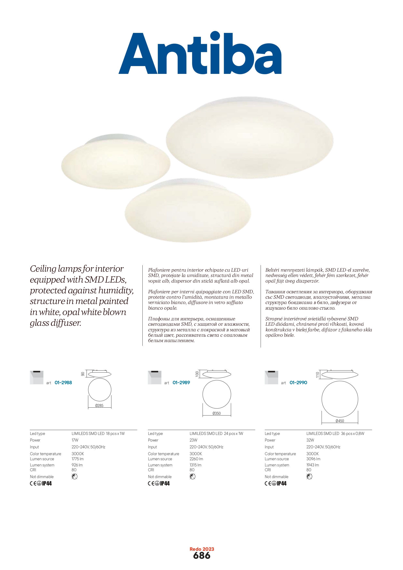Осветителното тяло 01-2990 ще осигури комфорт и естетика във всяко помещение, в което се постави. Цялостната визия и дизайн на лампата и вложените в изработката й материали, като метал в бяло, дифузер от издухано опалово бяло стъкло, ще допринесат за един неповторим стил. Благодарение на дългогодишния опит, качествените материали и строгия контрол на качеството на изработка на дизайнерската линия Redo Indoor на производителя Redo (Румъния), 01-2990 е на високо европейско ниво.