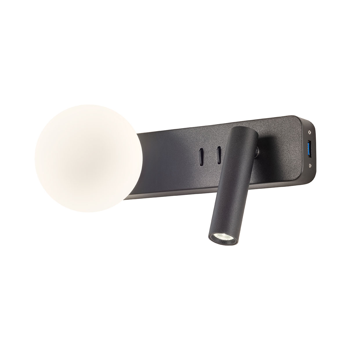 метал в цвят черен мат, дифузер от опалово сатенирано стъкло, спот лампа, USB порт 2A и ключове ON/OFF