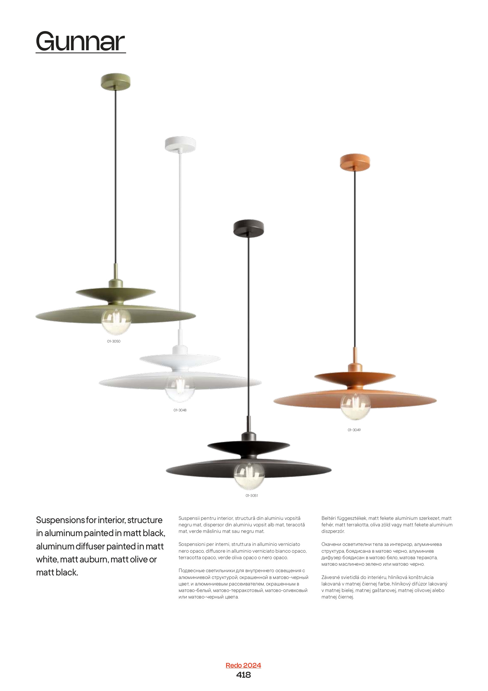 Осветителното тяло 01-3051 ще осигури комфорт и естетика във всяко помещение, в което се постави. Цялостната визия и дизайн на лампата и вложените в изработката й материали, като алуминий в матово черен цвят, ще допринесат за един неповторим стил. Благодарение на дългогодишния опит, качествените материали и строгия контрол на качеството на изработка на дизайнерската линия Redo Indoor на производителя Redo (Румъния), 01-3051 е на високо европейско ниво.