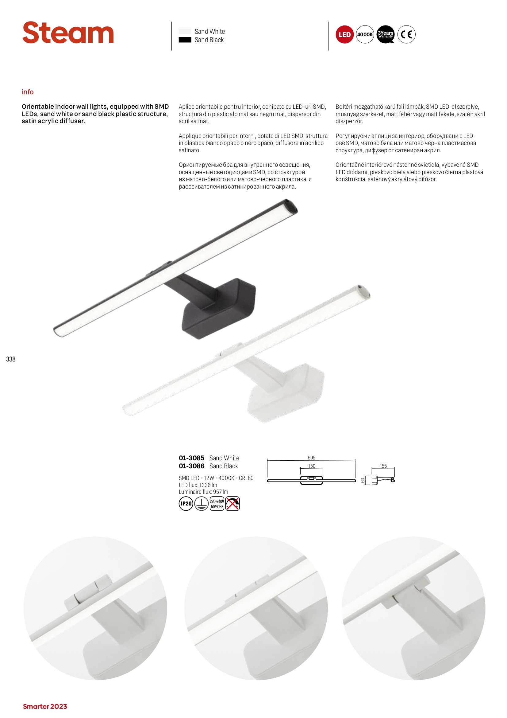 Осветителното тяло 01-3085 ще осигури комфорт и естетика във всяко помещение, в което се постави. Цялостната визия и дизайн на лампата и вложените в изработката й материали, като полимер в бял цвят, дифузер от сатениран акрил, възможност за завъртане на осветителния елемент, ще допринесат за един неповторим стил. Благодарение на дългогодишния опит, качествените материали и строгия контрол на качеството на изработка на дизайнерската линия Redo Smarter на производителя Redo (Румъния), 01-3085 е на високо европейско ниво.
