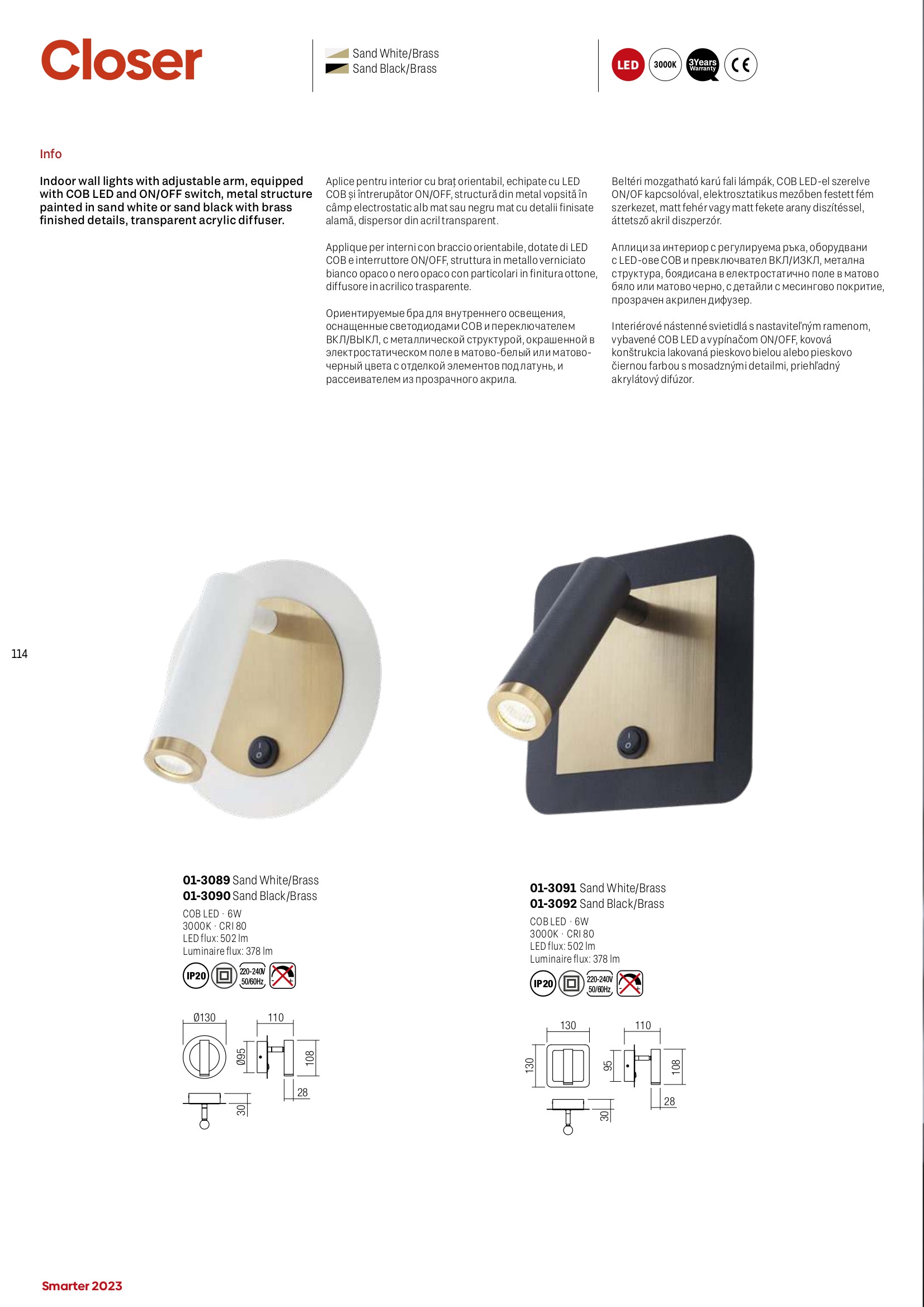 Лед аплик 01-3090 ще осигури комфорт и естетика във всяко помещение, в което се постави. Цялостната визия и дизайн на led лампата и вложените в изработката й материали, като метал с електростатично нанесено покритие в матово черен цвят, детайли с месингово покритие, подвижна глава, прозрачен акрилен дифузер, интегриран ключ ON/OFF, ще допринесат за един неповторим стил. Благодарение на дългогодишния опит в производството на лед осветление, качествените материали и строгия контрол на качеството на изработка на дизайнерската линия Redo Smarter на производителя Redo (Румъния), 01-3090 е на високо европейско ниво.