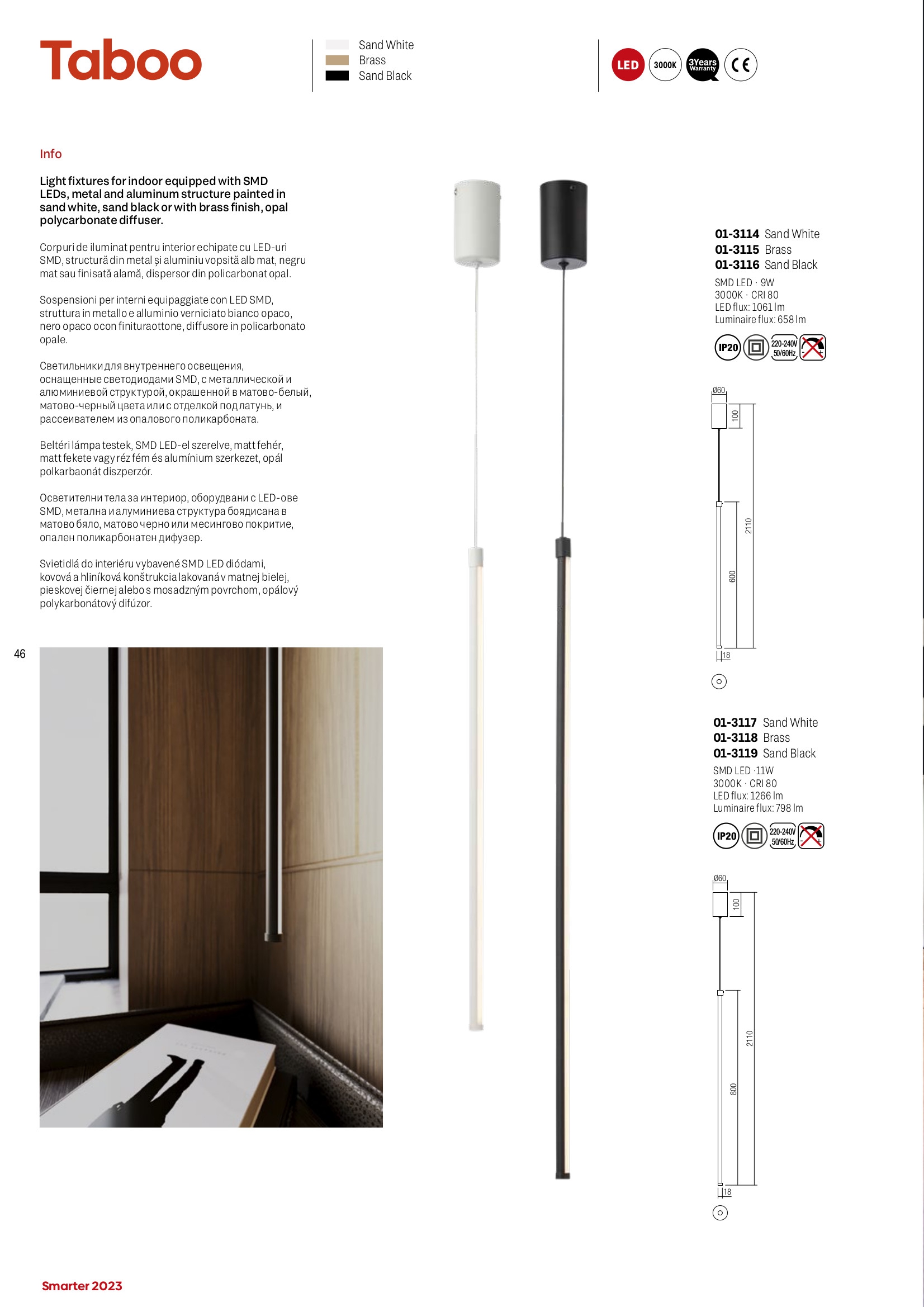 Лед пендел 01-3114 ще осигури комфорт и естетика във всяко помещение, в което се постави. Цялостната визия и дизайн на led лампата и вложените в изработката й материали, като метал и алуминий в матово бял цвят, дифузер от поликарбонат в опалово бял цвят, ще допринесат за един неповторим стил. Благодарение на дългогодишния опит в производството на лед осветление, качествените материали и строгия контрол на качеството на изработка на дизайнерската линия Redo Smarter на производителя Redo (Румъния), 01-3114 е на високо европейско ниво.