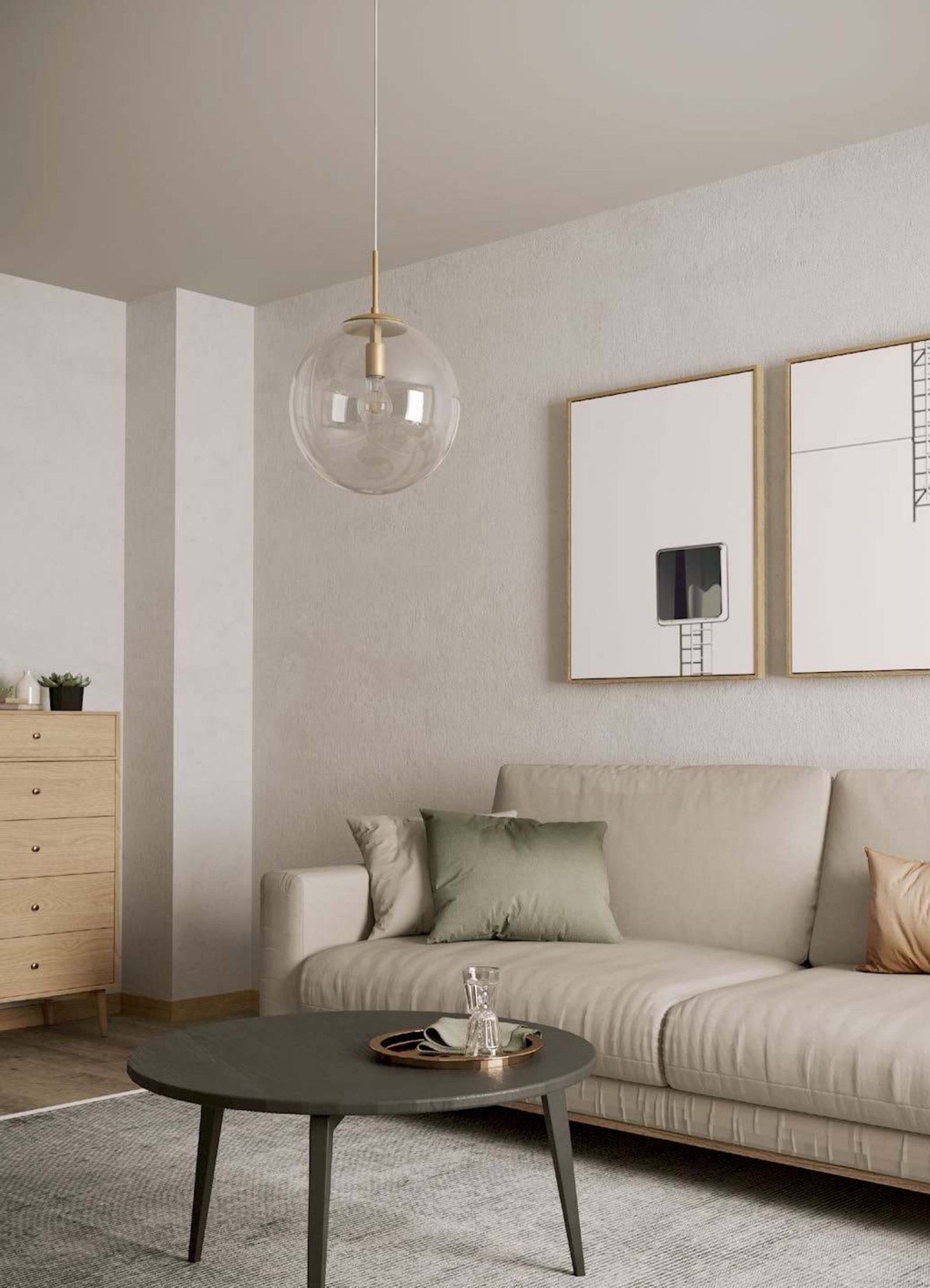 Стилът и естетиката на обстановката ще се обогатят благодарение, както на цялостната визия и дизайн на осветителното тяло, така и на вложените в изработката му, качествени материали, като: метал в цвят матово злато, дифузер от издухано прозрачно стъкло.