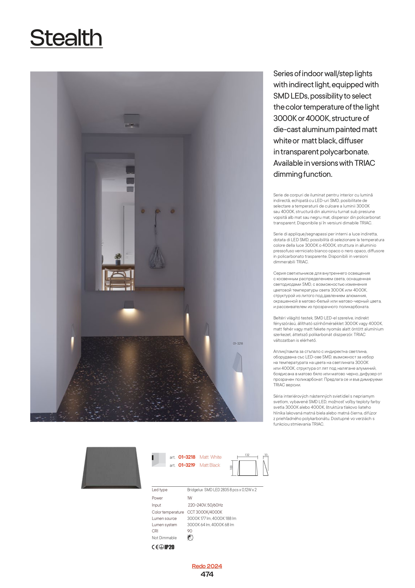 Лед аплик 01-3223 ще осигури комфорт и естетика във всяко помещение, в което се постави. Цялостната визия и дизайн на led лампата и вложените в изработката й материали, като лят под налягане алуминий в матово черен цвят, дифузер от прозрачен поликарбонат, индиректна светлина ССТ 3000/4000К, ще допринесат за един неповторим стил. Благодарение на дългогодишния опит в производството на лед осветление, качествените материали и строгия контрол на качеството на изработка на дизайнерската линия Redo Indoor на производителя Redo (Румъния), 01-3223 е на високо европейско ниво.