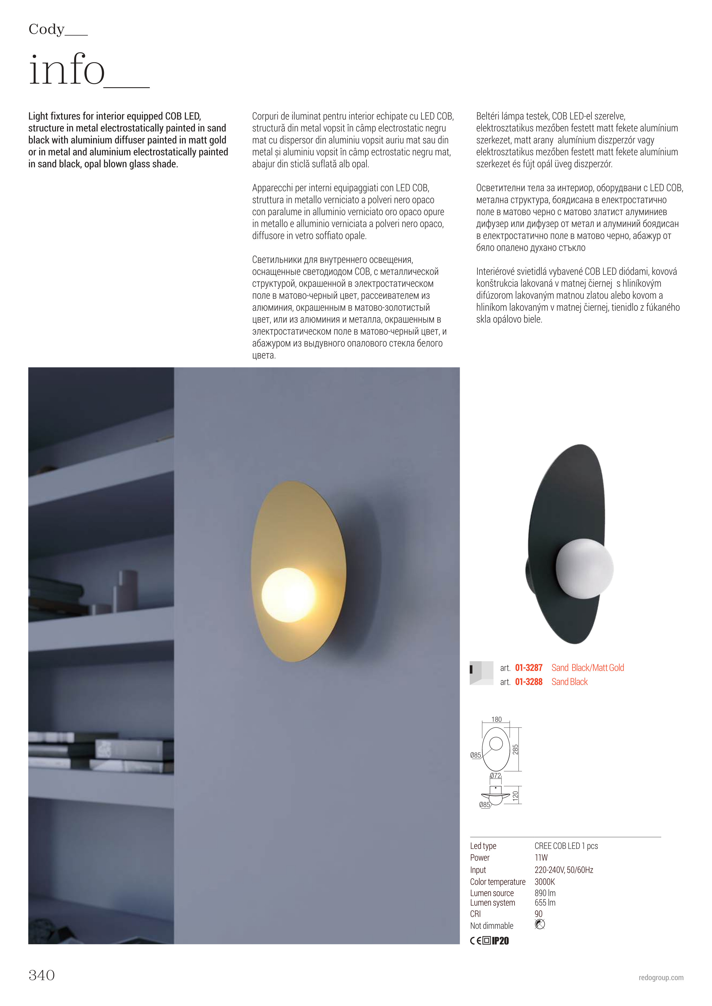 Осветителното тяло 01-3287 ще осигури комфорт и естетика във всяко помещение, в което се постави. Цялостната визия и дизайн на лампата и вложените в изработката й материали, като метал и алуминий в матово златисто и матово черно, дифузер от опалово бяло издухано стъкло, ще допринесат за един неповторим стил. Благодарение на дългогодишния опит, качествените материали и строгия контрол на качеството на изработка на дизайнерската линия Redo Indoor на производителя Redo (Румъния), 01-3287 е на високо европейско ниво.