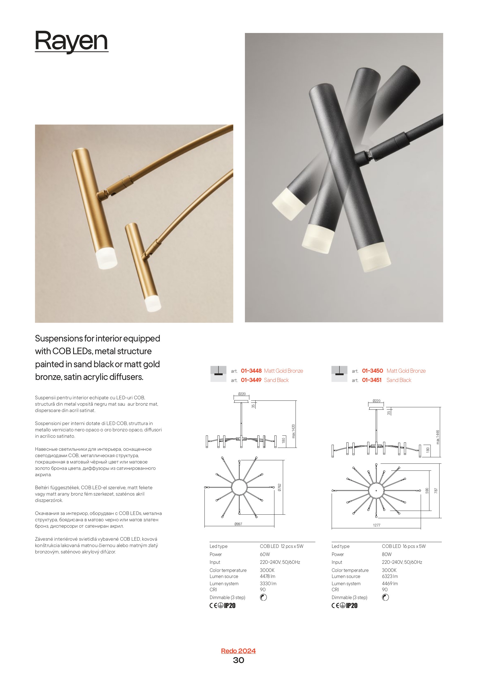 Осветителното тяло 01-3449 ще осигури комфорт и естетика във всяко помещение, в което се постави. Цялостната визия и дизайн на лампата и вложените в изработката й материали, като метал в цвят черен мат, насочавщи се дифузьори от сатениран акрил, ще допринесат за един неповторим стил. Благодарение на дългогодишния опит, качествените материали и строгия контрол на качеството на изработка на дизайнерската линия Redo Indoor на производителя Redo (Румъния), 01-3449 е на високо европейско ниво.